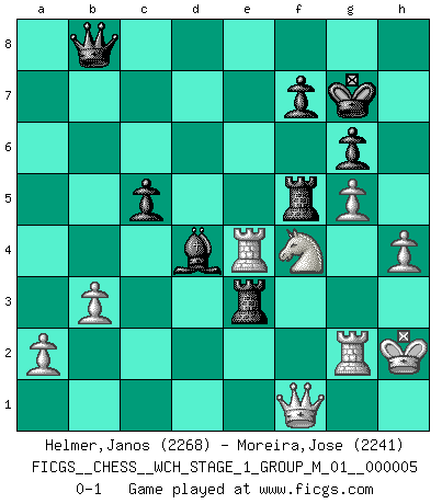 Last move : 0-1 2008 November 16 21:21:6 [Event "FICGS__CHESS__WCH_STAGE_1_GROUP_M_01__000005"] [Site "FICGS"] [Date "2008.07.08"] [Round "1"] [White "Helmer,Janos"] [Black "Moreira,Jose"] [Result "0-1"] [WhiteElo "2268"] [BlackElo "2241"] 1.c4 Nf6 2.Nc3 g6 3.d4 Bg7 4.e4 d6 5.Nf3 O-O 6.Be2 e5 7.O-O exd4 8.Nxd4 Re8 9.f3 Nc6 10.Be3 Nh5 11.g3 Bh3 12.Rf2 Nf6 13.Qd2 a6 14.Rd1 Ne5 15.Bg5 Qd7 16.b3 Rac8 17.Nd5 Nxd5 18.cxd5 c5 19.dxc6 bxc6 20.Bh6 Bh8 21.Bxa6 Ra8 22.Bf1 Bxf1 23.R2xf1 d5 24.exd5 Qxd5 25.Bf4 c5 26.Bxe5 Rxe5 27.Ne2 Qc6 28.Nf4 Rae8 29.Rf2 Re3 30.Qd7 Qa8 31.Qd5 Qa7 32.Kg2 Bd4 33.Rc2 R8e5 34.Qc6 Re7 35.R1d2 Rc7 36.Qd5 Rd7 37.Qc4 Qb7 38.Rf2 Re1 39.Rfe2 Rg1+ 40.Kh3 Rd6 41.Re8+ Kg7 42.Qe2 Qd7+ 43.g4 Rf6 44.Re4 h5 45.Rd2 hxg4+ 46.fxg4 Qb7 47.Qf3 Qa8 48.Rg2 Qh8+ 49.Kg3 Rc1 50.Rge2 Qb8 51.g5 Rg1+ 52.Rg2 Rf5 53.h4 Rc1 54.Kh2 Rc3 55.Qf1 Re3 0-1 English Opening Kingside Castling by player Black (move 5) Kingside Castling by player White (move 7) Player Black won this chess game. Follow this game move after move (download)Chess is a part of culture and if a culture is declining then Chess too will decline. (Mikhail Botvinnik) Wenn Du nicht kämpfst, um anderen etwas zu beweisen, sondern nur für Dich selbst, dann bist du fast unbesiegbar. (Garry Kasparov) Cuando tengas duda... ¡juega al Ajedrez!. (Tevis) Tous ces prétendus hommes politiques sont les pions, les Cavaliers, les Tours ou les Fous d'une partie d'échecs qui se jouera tant qu'un hasard ne renversera pas l'échiquier. (Honoré de Balzac) No enterprise is more likely to succeed than one concealed from the enemy until it is ripe for execution. (Niccolo Machiavelli)