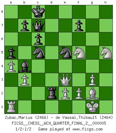 Last move : 1/2-1/2 2008 October 19 15:31:51 [Event "FICGS__CHESS__WCH_QUARTER_FINAL_2__000005"] [Site "FICGS"] [Date "2008.07.08"] [Round "3"] [White "Zubac,Marius"] [Black "de Vassal,Thibault"] [Result "1/2-1/2"] [WhiteElo "2466"] [BlackElo "2464"] 1.d4 d5 2.c4 dxc4 3.Nf3 Nf6 4.Nc3 c6 5.a4 Bf5 6.Ne5 Nbd7 7.Nxc4 Qc7 8.g3 e5 9.dxe5 Nxe5 10.Bf4 Nfd7 11.Bg2 g5 12.Ne3 gxf4 13.Nxf5 O-O-O 14.Qc2 Nc5 15.O-O Ne6 16.Rfd1 Bc5 17.Ne4 Bb4 18.Nf6 fxg3 19.hxg3 h5 20.Rxd8 Rxd8 21.Nxh5 Rd2 22.Qe4 a5 23.b3 Nc5 24.Qe3 Ng4 25.Qg5 Ne5 26.Qe3 1/2-1/2 QGA, 4.Nc3 Queenside Castling by player Black (move 13) Kingside Castling by player White (move 15) This chess game ended in a draw. Follow this game move after move (download)First-class players lose to second-class players because second-class players sometimes play a first-class game. (Siegbert Tarrasch) Die Auseinandersetzung mit Karpow war politisch geprägt. Er stand für das kommunistische System, wurde von dessen Repräsentanten gehätschelt. Ich war der Oppositionelle. Jeder Schachweltmeister spiegelt auch die gesellschaftlichen Verhältnisse wider. Kramnik steht für die Börsen-Generation des Neuen Markts, ideologiefrei, zahlenfixiert. (Garry Kasparov) En el Ajedrez, cuando menos, el valiente hereda la tierra. (Edmar Mednis) Soyez une menace à chaque fois que vous vous asseyez pour jouer. (Ken Smith) Live, lose, and learn, by observing your opponent how to win. (Amber Steenbock)