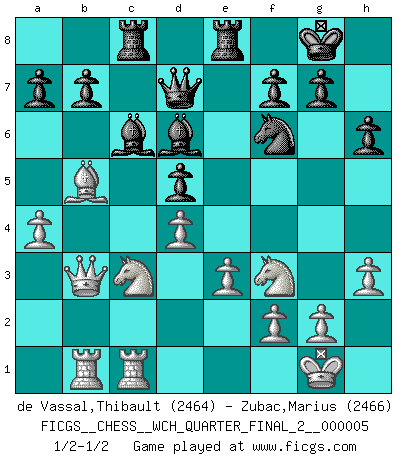 Last move : 1/2-1/2 2008 October 19 19:27:36 [Event "FICGS__CHESS__WCH_QUARTER_FINAL_2__000005"] [Site "FICGS"] [Date "2008.07.08"] [Round "4"] [White "de Vassal,Thibault"] [Black "Zubac,Marius"] [Result "1/2-1/2"] [WhiteElo "2464"] [BlackElo "2466"] 1.d4 d5 2.c4 e6 3.Nc3 Nf6 4.cxd5 exd5 5.Bg5 Be7 6.e3 c6 7.Bd3 Nbd7 8.Qc2 h6 9.Bh4 O-O 10.Nf3 Re8 11.O-O Ne4 12.Bxe4 Bxh4 13.Bh7+ Kh8 14.Bd3 Be7 15.Rab1 Bd6 16.b4 Nf6 17.b5 Bd7 18.Rfc1 Qe7 19.bxc6 Bxc6 20.Nb5 Bb8 21.Nc3 Bd6 22.Bb5 Rac8 23.Qb3 Qd7 24.a4 Kg8 25.h3 1/2-1/2 QGD : Exchange, positional line Kingside Castling by player Black (move 9) Kingside Castling by player White (move 11) This chess game ended in a draw. Follow this game move after move (download)A Chess game is a dialogue, a conversation between a player and his opponent. Each move by the opponent may contain threats or be a blunder, but a player cannot defend against threats or take advantage of blunders if he does not first ask himself: What is my opponent planning after each move ? (Bruce A. Moon) Mein Gehirn das ist mein zweitwichtigstes Organ [Aus dem Film: Der Schläfer]. (Woody Allen) Si tu oponente no puede hacer nada activo, entonces no apures la posición; En vez de eso, dejalo estar sentado ahí, sufriendo y rogandote por un empate. (Jeremy Silman) Les échecs sont un jeu terrible. Si vous n'avez pas le centre, votre adversaire a une position plus libre. Par contre, si vous avez le centre, alors vous avez vraiment quelque chose pour laquelle vous inquiéter ! (Siegbert Tarrasch) The age of a woman doesn't mean a thing. The best tunes are played on the oldest fiddles. (Ralph Waldo Emerson)