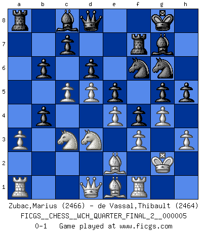 Last move : 0-1 2008 September 28 22:32:10 [Event "FICGS__CHESS__WCH_QUARTER_FINAL_2__000005"] [Site "FICGS"] [Date "2008.07.08"] [Round "7"] [White "Zubac,Marius"] [Black "de Vassal,Thibault"] [Result "0-1"] [WhiteElo "2466"] [BlackElo "2464"] 1.d4 Nf6 2.c4 g6 3.Nc3 Bg7 4.e4 d6 5.Nf3 O-O 6.Be2 e5 7.O-O Nc6 8.d5 Ne7 9.Ne1 Nd7 10.Nd3 f5 11.Bd2 Nf6 12.f3 f4 13.g4 g5 14.Be1 h5 15.h3 b6 16.Kg2 Rf7 17.b4 a5 18.a3 Ng6 19.c5 axb4 0-1 This chess game has been lost on time (started : 2008.07.08 16:48:36) King's Indian : Orthodox, Aronin-Taimanov variation (Yugoslav attack / Mar del Plata variation) Kingside Castling by player Black (move 5) Kingside Castling by player White (move 7) Player Black won this chess game. Follow this game move after move (download)A Chess game is divided into three stages: the first, when you hope you have the advantage, the second when you believe you have an advantage, and the third... when you know you're going to lose ! (Savielly Tartakower) Wenn du gegen Bobby spielst, ist es keine Frage von gewinnen oder verlieren. Es ist eine Frage des Überlebens. (Boris Vassilievich Spassky) Vive, pierde y aprende al observar a tu oponente como ganar. (Amber Steenbock) Tous ces prétendus hommes politiques sont les pions, les Cavaliers, les Tours ou les Fous d'une partie d'échecs qui se jouera tant qu'un hasard ne renversera pas l'échiquier. (Honoré de Balzac) The ego is not master in its own house. (Sigmund Freud)