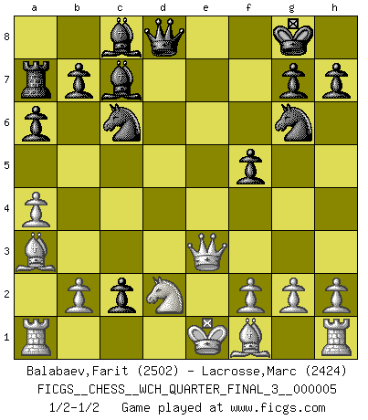 Last move : 1/2-1/2 2008 July 27 8:47:13 [Event "FICGS__CHESS__WCH_QUARTER_FINAL_3__000005"] [Site "FICGS"] [Date "2008.07.08"] [Round "1"] [White "Balabaev,Farit"] [Black "Lacrosse,Marc"] [Result "1/2-1/2"] [WhiteElo "2502"] [BlackElo "2424"] 1.e4 c5 2.Nf3 e6 3.d4 cxd4 4.Nxd4 Bc5 5.Nb3 Bb6 6.Nc3 Ne7 7.Bf4 d5 8.Qf3 d4 9.Nb5 O-O 10.Qg3 a6 11.Nc7 Ra7 12.a4 Ng6 13.Bd6 f5 14.exf5 exf5 15.Nd2 d3 16.Bxf8 Bxc7 17.Qe3 Nc6 18.Ba3 dxc2 19.Qd3 Qe8+ 20.Qe3 Qd8 21.Qd3 Qe8+ 22.Qe3 Qd8 1/2-1/2 Sicilian defense Kingside Castling by player Black (move 9) This chess game ended in a draw. Follow this game move after move (download)What is the object of playing a gambit opening?... To acquire a reputation of being a dashing player at the cost of losing a game. (Siegbert Tarrasch) Die Arbeit ist etwas Unnatürliches. Die Faulheit allein ist göttlich. (Anatole France) No hay precio que no valga la pena por la cabellera del Rey enemigo. (Koblentz) Les pièces de l'échiquier étaient impitoyables. Elles le retenaient, elles l'absorbaient. Il y avait de l'horreur en cela, mais aussi une harmonie unique. Car, qu'y a-t-il dans le monde, à part les échecs ? (V. Nabokov) Thus, what is of supreme importance in war is to attack the enemy's strategy. (Sun Tzu)