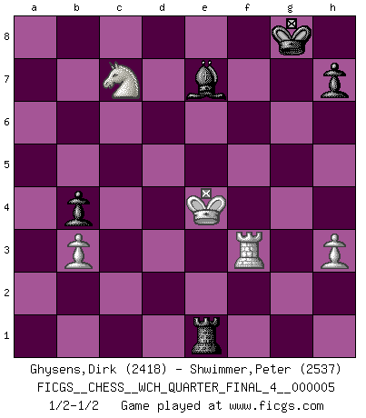 Last move : 1/2-1/2 2008 August 21 22:34:39 [Event "FICGS__CHESS__WCH_QUARTER_FINAL_4__000005"] [Site "FICGS"] [Date "2008.07.08"] [Round "4"] [White "Ghysens,Dirk"] [Black "Shwimmer,Peter"] [Result "1/2-1/2"] [WhiteElo "2418"] [BlackElo "2537"] 1.Nf3 c5 2.e4 Nc6 3.d4 cxd4 4.Nxd4 e5 5.Nb5 d6 6.N1c3 a6 7.Na3 Nf6 8.Bg5 b5 9.Bxf6 gxf6 10.Nd5 f5 11.c3 Bg7 12.exf5 Bxf5 13.Nc2 Be6 14.g3 O-O 15.Bg2 a5 16.O-O f5 17.Re1 Rc8 18.Re2 Kh8 19.Rd2 f4 20.Be4 Bh6 21.Qh5 Qg5 22.Qxg5 Bxg5 23.gxf4 Bxf4 24.Nde3 d5 25.Bxd5 Nd4 26.Rxd4 exd4 27.Bxe6 dxe3 28.Bxc8 exf2+ 29.Kxf2 Rxc8 30.Nd4 b4 31.cxb4 axb4 32.h3 Bg5 33.Rf1 Ra8 34.Ne6 Be7 35.Ke3 Kg8 36.b3 Rxa2 37.Rf3 Ra6 38.Nc7 Ra1 39.Ke4 Re1+ 1/2-1/2 Reti Opening Kingside Castling by player Black (move 14) Kingside Castling by player White (move 16) 10 pieces endgame at move 36 : White KRNPP , Black KRBPP WHITE : King + 1 Rook 1 Knight 2 Pawns BLACK : King + 1 Rook 1 Bishop 2 Pawns This chess game ended in a draw. Follow this game move after move (download)The game of chess is the touchstone of the intellect. (Goethe) Bis zum Jahr 1971 verlief in meiner Schachkariere alles glatt. Dieses dramatische Match [Fischer-Taimanov 6:0] machte mein Leben zur Hölle. (Mark Taimanov) Hasta este punto, las blancas han seguido un análisis bien conocido. Pero ahora el hace un error fatal: empieza a usar su propia cabeza. (Siegbert Tarrasch) Je menace de comprendre la position. (Anonyme) Pretend inferiority and encourage his arrogance. (Sun Tzu)
