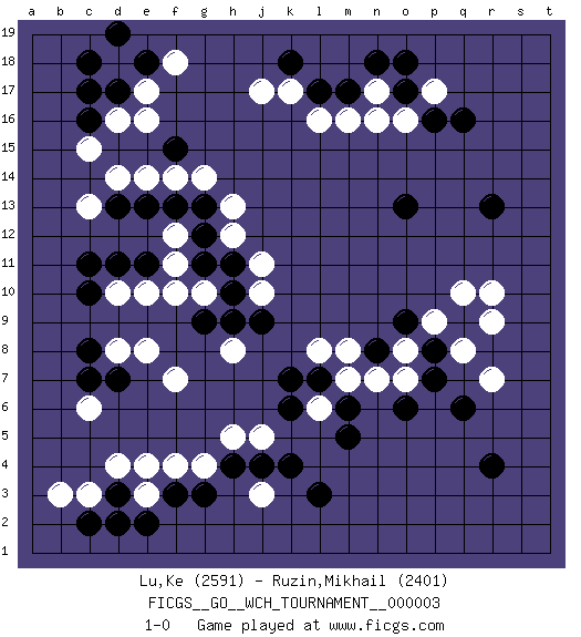 Last move : 1-0 2009 January 30 10:3:15 [Event "FICGS__GO__WCH_TOURNAMENT__000003"] [Site "FICGS"] [Date "2008.07.08"] [Round "1"] [Black "Lu,Ke"] [White "Ruzin,Mikhail"] [Result "1-0"] [Rating 1 "2591"] [Rating 2 "2401"] 1.q16 d4 2.r4 d16 3.f3 c6 4.l3 r10 5.r13 r7 6.q9 r9 7.q6 q8 8.p8 p9 9.o9 q10 10.p7 j3 11.d3 c3 12.c2 e3 13.d2 f4 14.e2 e4 15.g3 g4 16.h4 h5 17.j4 j5 18.k4 l6 19.m6 m7 20.m5 n7 21.o6 o8 22.n8 o7 23.l7 l8 24.k7 m8 25.k6 h8 26.c11 c13 27.c8 d10 28.c10 d8 29.d11 e10 30.e11 f11 31.d7 e8 32.c7 f12 33.d13 d14 34.e13 g14 35.f15 e14 36.f13 f14 37.g13 h13 38.g12 h12 39.g11 g10 40.h11 j11 41.h10 j10 42.g9 f10 43.h9 f7 44.j9 b3 45.d17 e17 46.c16 e16 47.c18 d18 48.c17 c15 49.e18 f18 50.d19 o16 51.m17 k17 52.o17 p17 53.p16 n17 54.o18 n16 55.n18 m16 56.l17 l16 57.k18 j17 58.o13 1-0 Here are the names of the openings (joseki) played in the four corners : Corner d4 : d4 f3 Hoshi (Hwajeom, Seongjeom, Xingwei`) 4-4 Point. The star or hoshi (4-4) point, emphasizing influence at the potential expense of territory. Ikken Kakari (Hankan Keolch'im, Yi Gua`jiao~, 1-Space Low Approach). Black 2 is the standard approach move to the 4-4. Corner d16 : d16 c11 Hoshi (Hwajeom, Seongjeom, Xingwei`) 4-4 Point. The star or hoshi (4-4) point, emphasizing influence at the potential expense of territory. Player Black won this Go (weiqi, baduk) game. Follow this game move after move (download)The rectangular six is normally alive. (Anonymous) Bobby never cared about money, though. His only desire was to prove that his choices were correct: He wanted chess to be important because he was a chess player, and he wanted to be important. Bobby knew money was important, but he didn't have a clue why, outside of clothes and status. The only way he could accomplish what he wanted was to fight for a lot of money. Once he got it, he gave it away. He did not know how to spend it. And once he'd become champion, after, essentially, sacrificing his life for it, he didn't know how to spend his time. (Bob Wade)