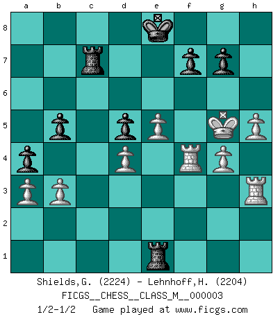 Last move : 1/2-1/2 2006 August 25 10:8:31 [Event "FICGS__CHESS__CLASS_M__000003"] [Site "FICGS"] [Date "2006.04.15"] [Round "1"] [White "Shields,Glen D."] [Black "Lehnhoff,Heinz-Georg"] [Result "1/2-1/2"] [WhiteElo "2224"] [BlackElo "2204"] 1.e4 c5 2.Nf3 e6 3.d4 cxd4 4.Nxd4 a6 5.Nc3 Qc7 6.Be2 Nf6 7.O-O Nc6 8.Be3 h5 9.f4 b5 10.Nxc6 Qxc6 11.Bf3 Ng4 12.Bd4 d6 13.e5 d5 14.Ne2 Bd7 15.h3 Nh6 16.Bxh5 Bc5 17.c3 Nf5 18.Bg4 Ne3 19.Bxe3 Bxe3+ 20.Kh1 Qc7 21.Nd4 Bxd4 22.cxd4 Rc8 23.f5 Qc6 24.Kh2 exf5 25.Bxf5 Rh4 26.Qd3 Bxf5 27.Rxf5 Qc2 28.Qf3 Qe4 29.Rf1 Qxf3 30.R5xf3 Rc7 31.g4 Rh6 32.Kg3 Rhc6 33.h4 Rc2 34.R1f2 Rc1 35.h5 Rg1+ 36.Kh4 Rd1 37.Rf4 a5 38.Kg5 Re1 39.Rh2 Rc6 40.a3 a4 41.Rh3 Re2 42.Rhf3 Rc7 43.b3 Re1 44.Rh3 1/2-1/2 Sicilian : Kan, 5.Nc3 Kingside Castling by player White (move 7) This chess game ended in a draw. Follow this game move after move (download)Chess is the art which expresses the science of logic. (Mikhail Botvinnik) Wer sich die Fähigkeit anerziehen will im Schach selbstständig zu denken, der muß alles meiden, was leblos ist: ausgeklügelte Theorien, die sich auf sehr wenige Beispiele und eine Menge Hirngespinste stützen. (Emanuel Lasker) El Ajedrez detiene a su maestro dentro de sus propios vínculos, encadenando la mente y el cerebro, por lo que la libertad interior del mas fuerte debe sufrir. (Albert Einstein) J'ai vu le vaincu d'Echecs jouer des années durant dans l'espoir de la fête de la victoire. Car tu es plus riche de ce qu'elle existe si même elle n'est point pour toi. Ainsi de la perle du fond des mers. (Antoine de Saint-Exupéry) Man is still the most extraordinary computer of all. (John F. Kennedy)