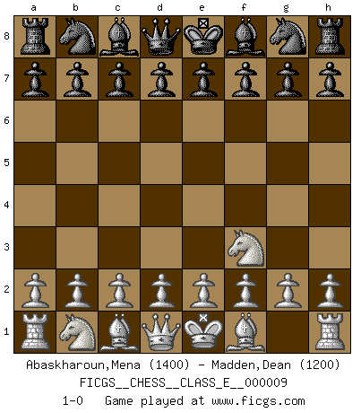 Last move : 1-0 2006 September 13 0:41:19 [Event "FICGS__CHESS__CLASS_E__000009"] [Site "FICGS"] [Date "2006.07.26"] [Round "1"] [White "Abaskharoun,Mena"] [Black "Madden,Dean"] [Result "1-0"] [WhiteElo "1400"] [BlackElo "1200"] 1.Nf3 1-0 This chess game has been lost on time (started : 2006.07.26 19:31:33) Reti Opening Player White won this chess game. Follow this game move after move (download)When you see a good move, look for a better one. (Emanuel Lasker) Weshalb minderdergeübte Spieler mit g2-g4 beginnen? Die betreffenden sind unschlüssig, ob sie nun rechts (h4) oder links (f4) beginnen sollen, und in ihrer Ratlosigkeit entschliessen sie sich nach guter Bürgerart dazu, den goldenen Mittelweg zu wählen. (Aaron Nimzowitsch) Del Ajedrez se ha dicho que la vida no es lo suficientemente larga para él, pero eso es culpa de la vida, no del Ajedrez. (William Ewart Napier) Aidez vos pièces, elles vous aideront. (Paul Morphy) It's not the will to win, but the will to prepare to win that makes the difference. (Bear Bryant)