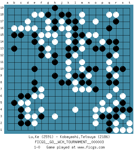 Last move : 1-0 2009 January 9 13:13:5 [Event "FICGS__GO__WCH_TOURNAMENT__000003 "] [Site "FICGS"] [Date "2008.07.08"] [Round "1"] [Black "Lu,Ke "] [White "Kobayashi,Tetsuya "] [Result "1-0"] [Rating 1 "2591"] [Rating 2 "2186"] 1.q16 d17 2.r4 d4 3.f3 h3 4.c3 d3 5.c4 d5 6.d2 e2 7.c2 e3 8.c6 p4 9.p3 o3 10.q3 o4 11.r6 l4 12.c15 e16 13.e15 f15 14.e14 c16 15.b15 o17 16.r14 k16 17.d6 f4 18.e10 f14 19.f13 g13 20.f12 o15 21.g14 h14 22.f16 g15 23.e17 d16 24.f17 b16 25.k18 h18 26.h17 j17 27.j18 g17 28.h16 g16 29.g18 f18 30.h19 e18 31.l16 k15 32.k17 j16 33.l15 k14 34.l14 m17 35.l17 m18 36.o13 q18 37.r17 r18 38.o7 r12 39.r10 p14 40.p13 q13 41.q14 q10 42.q12 q11 43.r13 r9 44.s10 r7 45.q8 s6 46.r8 r5 47.s5 q6 48.q9 s3 49.s4 r2 50.s2 t2 51.s1 r1 52.r3 t1 53.s2 s1 54.q5 p5 55.r6 c5 56.b5 r5 57.q2 o2 58.q1 q4 59.t4 e6 60.e7 f6 61.b13 f7 62.e8 m7 63.m8 l8 64.m9 n7 65.l9 k9 66.k8 l7 67.j8 k10 68.h9 m11 69.o10 m13 70.n14 m14 71.m15 n15 72.l13 l12 73.k13 h15 74.k12 k11 75.h12 n9 76.n10 m10 77.n8 g12 78.h11 1-0 Here are the names of the openings (joseki) played in the four corners : Corner d4 : d4 f3Hoshi (Hwajeom, Seongjeom, Xingwei`) 4-4 Point. The star or hoshi (4-4) point, emphasizing influence at the potential expense of territory.Ikken Kakari (Hankan Keolch'im, Yi Gua`jiao~, 1-Space Low Approach). Black 2 is the standard approach move to the 4-4. Corner q4 : r4 p4Komoku (Somok, Xiao~mu`) 3-4 Point. The komoku (3-4) point is the traditional corner enclosure move..Ikken Takagakari (Hankan Nop'dakeolch'im, Yi Gaogua`jiao~, 1-Space High Approach). The 5-4 approach move has become more popular in modern times, as modern Go emphasizes speed and influence. Corner d16 : d17 c15Komoku (Somok, Xiao~mu`) 3-4 Point. The komoku (3-4) point is the traditional corner enclosure move..Ikken Kakari (Hankan Keolch'im, Yi Gua`jiao~, 1-Space Low Pincer). The small knight move is the basic approach move to the 3-4 point stone. It has been continually used for over four centuries. There are limitless variations, with new moves constantly being discovered. Black 2 opens the door to a treaure store of joseki. Corner q16 : q16 o17Hoshi (Hwajeom, Seongjeom, Xingwei`) 4-4 Point. The star or hoshi (4-4) point, emphasizing influence at the potential expense of territory.Ikken Kakari (Hankan Keolch'im, Yi Gua`jiao~, 1-Space Low Approach). White 2 is the standard approach move to the 4-4. Player Black won this Go (weiqi, baduk) game.Follow this game move after move (download ) With less than 15 stones in danger, tenuki. (Anonymous) Plans are ideas that never come to fruition. (Daniel Parmet)
