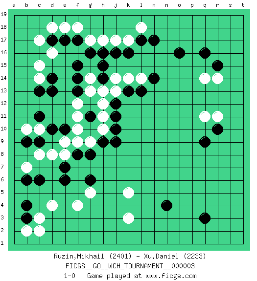 Last move : 1-0 2008 August 13 13:44:59 [Event "FICGS__GO__WCH_TOURNAMENT__000003"] [Site "FICGS"] [Date "2008.07.08"] [Round "1"] [Black "Ruzin,Mikhail"] [White "Xu,Daniel"] [Result "1-0"] [Rating 1 "2401"] [Rating 2 "2233"] 1.q16 d4 2.q3 d16 3.q9 k3 4.k16 r14 5.r15 q14 6.o16 q11 7.r10 r11 8.n4 k5 9.f17 c14 10.c6 c8 11.e6 f4 12.b4 c3 13.b3 c2 14.d10 e8 15.g6 f9 16.d13 g5 17.e7 b7 18.b6 b2 19.c9 d8 20.g8 g9 21.h9 h10 22.j9 f11 23.d14 c15 24.c13 d18 25.j10 h11 26.j11 h12 27.f15 h17 28.h16 j17 29.j16 k17 30.l17 l18 31.m17 g17 32.g16 f18 33.e17 e18 34.d17 c17 35.e10 f10 36.f8 e9 37.f13 j13 38.l13 g13 39.h14 g14 40.f14 j14 41.h15 l14 42.j12 h13 43.k13 f12 44.g11 c10 45.c11 k14 46.m14 b10 47.b9 1-0 Here are the names of the openings (joseki) played in the four corners : Corner q16 : q16 r14 Hoshi (Hwajeom, Seongjeom, Xingwei`) 4-4 Point. The star or hoshi (4-4) point, emphasizing influence at the potential expense of territory. Ikken Kakari (Hankan Keolch'im, Yi Gua`jiao~, 1-Space Low Approach). White 2 is the standard approach move to the 4-4. Corner d16 : d16 f17 Hoshi (Hwajeom, Seongjeom, Xingwei`) 4-4 Point. The star or hoshi (4-4) point, emphasizing influence at the potential expense of territory. Ikken Kakari (Hankan Keolch'im, Yi Gua`jiao~, 1-Space Low Approach). Black 2 is the standard approach move to the 4-4. Corner d4 : d4 c6 Hoshi (Hwajeom, Seongjeom, Xingwei`) 4-4 Point. The star or hoshi (4-4) point, emphasizing influence at the potential expense of territory. Ikken Kakari (Hankan Keolch'im, Yi Gua`jiao~, 1-Space Low Approach). Black 2 is the standard approach move to the 4-4. Player Black won this Go (weiqi, baduk) game. Follow this game move after move (download)Never try to cut bamboo joints. (Anonymous) A journey of a thousand sites begins with a single click. (Author unknown)