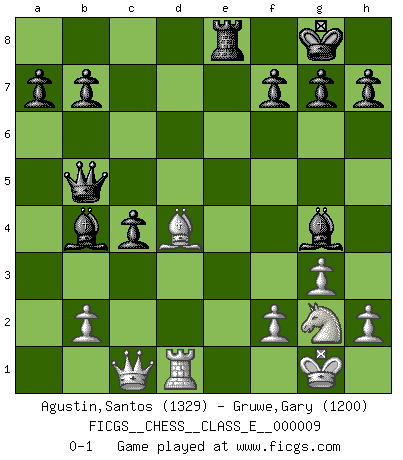 Last move : 0-1 2006 December 17 18:44:30 [Event "FICGS__CHESS__CLASS_E__000009"] [Site "FICGS"] [Date "2006.07.26"] [Round "1"] [White "Agustin,Santos"] [Black "Gruwe,Gary"] [Result "0-1"] [WhiteElo "1329"] [BlackElo "1200"] 1.d4 Nf6 2.c4 c5 3.Nf3 e6 4.Nc3 Na6 5.e4 Be7 6.Be2 d6 7.O-O O-O 8.a4 Re8 9.e5 Nd7 10.exd6 Bxd6 11.d5 Nf6 12.Re1 exd5 13.Nxd5 Nxd5 14.cxd5 Nb4 15.Bb5 Rxe1+ 16.Nxe1 Nxd5 17.g3 Be6 18.Ra3 c4 19.Ra1 Nc7 20.Qc2 Nxb5 21.axb5 Qb6 22.Be3 Qxb5 23.Rd1 Bb4 24.Bd4 Re8 25.Ng2 Bf5 26.Qc1 Bg4 0-1 Benoni defense Kingside Castling by player White (move 7) Kingside Castling by player Black (move 7) Player Black won this chess game. Follow this game move after move (download)Chess is war over the board. The object is to crush the opponents mind. (Bobby Fischer) Wie kann ich Remis annehmen? Ich weiß ja gar nicht, wie ich stehe! (Fritz Sämisch) No soy una persona materialista y por eso, no resiento la falta o pérdida del dinero. La ausencia de cosas mundanas carece de importancia. Ya que el Ajedrez es una forma en la que puedo ser tan materialista como yo desee sin tener la necesidad de vender mi alma. (Jamie Walter Adams) Le joueur d'Echecs qui veut atteindre le top est obligé de développer son propre credo créatif. Alexeï Stepanovicth Souétine. Il est facile d'écrire des livres ! Ce qui est difficile, c'est de jouer ! (Alexeï Stepanovicth Souétine) Wawaweewa ! (Borat: Cultural learnings of America for make benefit glorious nation of Kazakhstan)