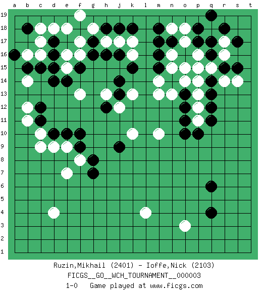 Last move : 1-0 2008 September 1 22:4:59 [Event "FICGS__GO__WCH_TOURNAMENT__000003"] [Site "FICGS"] [Date "2008.07.08"] [Round "1"] [Black "Ruzin,Mikhail"] [White "Ioffe,Nick"] [Result "1-0"] [Rating 1 "2401"] [Rating 2 "2103"] 1.q17 d4 2.q4 c17 3.q11 k16 4.m16 o3 5.q6 l4 6.d16 c16 7.d15 e18 8.g16 k13 9.d17 d18 10.c15 c10 11.b18 c18 12.b15 b16 13.d10 d9 14.e10 e9 15.c11 c9 16.f10 k10 17.f9 e7 18.g7 f8 19.g8 n15 20.m15 m14 21.n14 o15 22.k15 m13 23.o13 o17 24.n17 n18 25.m18 r16 26.q16 r17 27.r15 n16 28.m17 q15 29.r18 r14 30.s15 q18 31.p18 p16 32.p17 o18 33.q19 s14 34.q14 p15 35.s17 p14 36.q13 p13 37.o12 p12 38.q12 n13 39.o11 p11 40.p10 o14 41.o10 m10 42.j9 h13 43.j14 h17 44.g17 g18 45.f18 f17 46.h18 f19 47.j16 j17 48.h16 f13 49.j13 j12 50.h12 b14 51.a16 f16 52.f15 e15 53.e14 e16 54.d14 b11 55.c12 b12 56.j18 k17 57.k18 1-0 Here are the names of the openings (joseki) played in the four corners : Corner q4 : q4 o3 Hoshi (Hwajeom, Seongjeom, Xingwei`) 4-4 Point. The star or hoshi (4-4) point, emphasizing influence at the potential expense of territory. Ikken Kakari (Hankan Keolch'im, Yi Gua`jiao~, 1-Space Low Approach). White 2 is the standard approach move to the 4-4. Corner d16 : c17 d16 San-San (Sam-Sam, San-San) 3-3 Point. The San-San (3-3) point, emphasizing territory at the expense of influence. Kata-tsuki (shoulder hit). The shoulder-hit is the traditional answer to the 3-3. The direction of White 3 depends on the positions on the side. Crawling once may be the premise for a follow-up move of sliding with a knight's move in the opposite direction. If White plays 3 at 3-4 (to the right), the follow-on knight's move is then played at the top (e.g. 3-4, 4-5, 5-2). White's knight's move reduces territory potential on the side it is played. Player Black won this Go (weiqi, baduk) game. Follow this game move after move (download)If you don't know ladders, don't play go. (Anonymous) There are two kinds of people in the world, my friend. Those who have a loaded gun and those who dig. You dig ! (Blondie in The Good, The Bad and The Ugly)