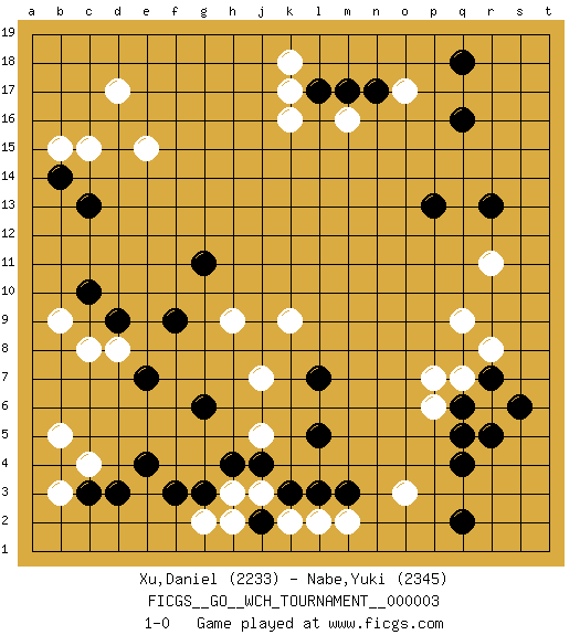 Last move : 1-0 2008 September 18 10:2:6 [Event "FICGS__GO__WCH_TOURNAMENT__000003"] [Site "FICGS"] [Date "2008.07.08"] [Round "1"] [Black "Xu,Daniel"] [White "Nabe,Yuki"] [Result "1-0"] [Rating 1 "2233"] [Rating 2 "2345"] 1.q16 c4 2.q4 d17 3.e4 j3 4.c3 b3 5.d3 b5 6.g3 o3 7.l3 j5 8.l5 r6 9.q6 q7 10.r5 p6 11.q5 p7 12.r7 r8 13.s6 q9 14.r13 o17 15.q18 k16 16.m17 m16 17.l17 k17 18.n17 c15 19.c10 c8 20.c13 e15 21.g6 j7 22.l7 k9 23.j2 k2 24.k3 h2 25.j4 h3 26.h4 g2 27.f3 l2 28.m3 m2 29.q2 r11 30.p13 k18 31.b14 b15 32.d9 b9 33.e7 d8 34.f9 h9 35.g11 1-0 This go game has been lost on time (started : 2008.07.08 16:52:56) Here are the names of the openings (joseki) played in the four corners : Corner d4 : c4 e4 Komoku (Somok, Xiao~mu`) 3-4 Point. The komoku (3-4) point is the traditional corner enclosure move.. Ikken Takagakari (Hankan Nop'dakeolch'im, Yi Gaogua`jiao~, 1-Space High Approach). The 5-4 approach move has become more popular in modern times, as modern Go emphasizes speed and influence. Corner q4 : q4 o3 Hoshi (Hwajeom, Seongjeom, Xingwei`) 4-4 Point. The star or hoshi (4-4) point, emphasizing influence at the potential expense of territory. Ikken Kakari (Hankan Keolch'im, Yi Gua`jiao~, 1-Space Low Approach). White 2 is the standard approach move to the 4-4. Player Black won this Go (weiqi, baduk) game. Follow this game move after move (download)Win the stones, lose the game. (Anonymous) Vladimir Ras-Putin is still alive... He is also a good actor, I saw him in the Lord of the Rings. (Rodolfo d'Ettorre)