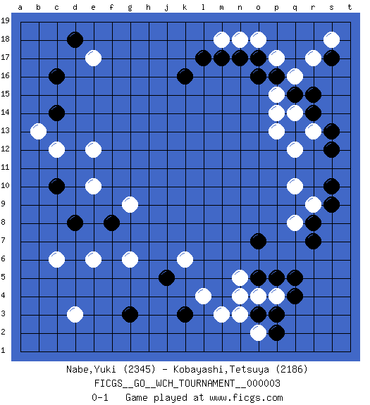 Last move : 0-1 2008 September 22 10:18:32 [Event "FICGS__GO__WCH_TOURNAMENT__000003"] [Site "FICGS"] [Date "2008.07.08"] [Round "1"] [Black "Nabe,Yuki"] [White "Kobayashi,Tetsuya"] [Result "0-1"] [Rating 1 "2345"] [Rating 2 "2186"] 1.p16 e17 2.q5 d3 3.c10 c6 4.c16 c12 5.c14 e12 6.d18 e10 7.d8 e6 8.f8 g6 9.k3 g9 10.g3 b13 11.k16 r17 12.r15 q16 13.q15 p17 14.o17 o18 15.n17 n18 16.m17 m18 17.l17 q10 18.r8 r13 19.s10 r9 20.s9 q8 21.r7 p15 22.o16 p14 23.s17 s18 24.q13 q14 25.r14 q12 26.s13 p13 27.s12 m3 28.o3 l4 29.j5 o4 30.p3 p4 31.q4 n3 32.o5 n5 33.p5 n4 34.o7 o2 35.p2 k6 0-1 This go game has been lost on time (started : 2008.07.08 16:52:56) Here are the names of the openings (joseki) played in the four corners : Corner d16 : e17 c16 Mokuhazushi (Waemok, Wai`mu`) 5-3 Point. The mokuhazushi (5-3) point was popular in the Edo period in Japan (1600 - 1867). It emphasizes influence; territorially, it is inferior to the 3-4 point. Komoku Kakari. Black 2 is the standard approach because of its solidity and stability. Corner q16 : p16 r17 Takamoku (Gomok, Gaomu`) 5-4 Point. The takamoku (high) point (5-4). With its emphasis on influence, the 5-4 point complements the 4-4 (hoshi) point in creating an influence-oriented fuseki. San-san. White plays the 3-3 when Black has a stone at top such as marked. Player White won this Go (weiqi, baduk) game. Follow this game move after move (download)The game plays itself, the players don't control it. (Pierre Audouard) All the troubles of the world come from being unable to sit alone in a quiet room. (Blaise Pascal)