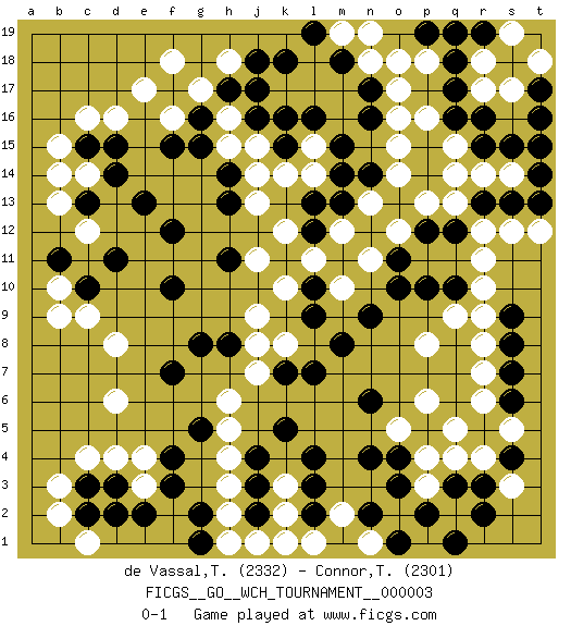 Last move : 0-1 2009 February 1 18:27:22 [Event "FICGS__GO__WCH_TOURNAMENT__000003"] [Site "FICGS"] [Date "2008.07.08"] [Round "1"] [Black "de Vassal,Thibault"] [White "Connor,Thomas"] [Result "0-1"] [Rating 1 "2332"] [Rating 2 "2301"] 1.q16 d4 2.q3 d16 3.r5 k3 4.f3 e3 5.f4 d6 6.k5 h3 7.l3 h5 8.g5 h6 9.f7 d8 10.g8 j7 11.l4 j9 12.f10 j11 13.f12 j13 14.e13 c14 15.g15 j15 16.f17 e17 17.d11 r14 18.n16 r11 19.k16 q2 20.r15 q14 21.p2 p3 22.r2 q4 23.r3 o2 24.o4 p4 25.q1 o5 26.n4 p6 27.o3 r7 28.k7 k8 29.l7 o17 30.q18 o16 31.n17 o15 32.j16 n18 33.m18 p18 34.s15 f18 35.s13 s14 36.t14 t12 37.t13 s12 38.r13 q13 39.s6 r17 40.q17 r18 41.r19 s19 42.q19 s17 43.t17 t18 44.t16 q15 45.r16 r12 46.s8 r8 47.m8 m10 48.n9 p8 49.o10 n11 50.q10 r10 51.c3 c4 52.d3 e4 53.e2 c9 54.b11 b10 55.c10 b9 56.s9 r9 57.m14 n13 58.m13 g17 59.h17 h18 60.j18 h16 61.j17 b3 62.g2 b2 63.c2 c1 64.d2 h15 65.g16 f16 66.f15 m12 67.o11 o12 68.c13 b14 69.d14 b13 70.d15 c16 71.c15 b15 72.n6 k2 73.j4 h4 74.j3 h2 75.j2 j1 76.g1 h1 77.l2 l1 78.m1 k1 79.t15 m2 80.n2 n1 81.o1 l15 82.k15 k14 83.m15 l14 84.l16 m19 85.l19 n19 86.k18 c12 87.p12 p13 88.q12 q9 89.p10 r6 90.s7 r4 91.s4 q5 92.l9 k10 93.h8 j8 94.l13 k12 95.p19 o18 96.n14 o14 97.h14 j14 98.l10 l11 99.l12 s5 100.h11 s3 101.h13 p16 0-1 Here are the names of the openings (joseki) played in the four corners : Corner d4 : d4 f3 Hoshi (Hwajeom, Seongjeom, Xingwei`) 4-4 Point. The star or hoshi (4-4) point, emphasizing influence at the potential expense of territory. Ikken Kakari (Hankan Keolch'im, Yi Gua`jiao~, 1-Space Low Approach). Black 2 is the standard approach move to the 4-4. Corner q16 : q16 r14 Hoshi (Hwajeom, Seongjeom, Xingwei`) 4-4 Point. The star or hoshi (4-4) point, emphasizing influence at the potential expense of territory. Ikken Kakari (Hankan Keolch'im, Yi Gua`jiao~, 1-Space Low Approach). White 2 is the standard approach move to the 4-4. Player White won this Go (weiqi, baduk) game. Follow this game move after move (download)In an unreasonable situation, an unreasonable move is reasonable. (Tamino) I'm extremely disappointed. I send you out for exciting, new designer drugs, you come back with tomato sauce. (Gregory House, House M.D.)