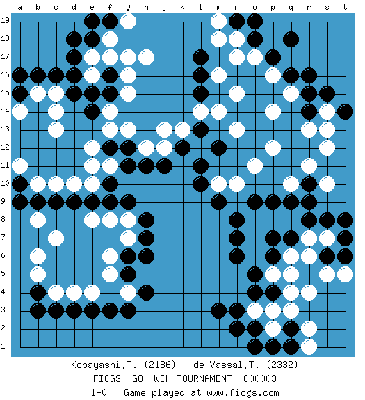 Last move : 1-0 2008 November 21 16:13:38 [Event "FICGS__GO__WCH_TOURNAMENT__000003"] [Site "FICGS"] [Date "2008.07.08"] [Round "1"] [Black "Kobayashi,Tetsuya"] [White "de Vassal,Thibault"] [Result "1-0"] [Rating 1 "2186"] [Rating 2 "2332"] 1.r16 d4 2.c16 r4 3.l17 p3 4.r10 c10 5.f3 f5 6.c3 c4 7.d3 e4 8.e3 c13 9.d9 d10 10.e9 e17 11.d17 e16 12.d15 h17 13.e18 f18 14.d18 n17 15.p17 n15 16.l15 n13 17.l13 m16 18.l16 p14 19.r14 p12 20.c9 e10 21.g9 c7 22.f10 e12 23.h4 f8 24.f9 g8 25.g12 f14 26.e14 f13 27.m3 j13 28.h8 g7 29.h7 e8 30.h6 l12 31.k12 k13 32.m12 l14 33.l11 m14 34.o4 r7 35.p4 q4 36.o9 o7 37.n7 o6 38.n6 o3 39.n3 p5 40.o5 o8 41.n8 p8 42.o18 n18 43.n19 m19 44.o19 m18 45.b4 b5 46.b3 b6 47.s8 s7 48.r8 r13 49.p9 q8 50.q9 b15 51.b16 c15 52.d16 s14 53.s15 s12 54.p6 q5 55.q7 q6 56.p7 g4 57.g3 j12 58.j11 h12 59.h11 p16 60.q16 o11 61.f15 g15 62.f16 f17 63.e15 g16 64.f19 g19 65.e19 g17 66.o2 p2 67.n2 o17 68.q18 n10 69.m9 m10 70.l10 f11 71.g11 s10 72.q2 q3 73.p1 r2 74.q1 r1 75.o1 b8 76.b9 b10 77.a10 a11 78.a9 c14 79.g6 f6 80.s6 r6 81.t7 s5 82.t6 t5 83.t8 r11 84.a15 a14 85.a16 q10 86.r9 q15 87.r15 g13 88.f12 e11 89.t14 s13 90.g5 1-0 Here are the names of the openings (joseki) played in the four corners : Corner d4 : d4 f3 Hoshi (Hwajeom, Seongjeom, Xingwei`) 4-4 Point. The star or hoshi (4-4) point, emphasizing influence at the potential expense of territory. Ikken Kakari (Hankan Keolch'im, Yi Gua`jiao~, 1-Space Low Approach). Black 2 is the standard approach move to the 4-4. Corner d16 : c16 c13 Komoku (Somok, Xiao~mu`) 3-4 Point. The komoku (3-4) point is the traditional corner enclosure move.. Player Black won this Go (weiqi, baduk) game. Follow this game move after move (download)Learn to play under the stones. (Anonymous) I don't know, I don't care, and it doesn't make any difference. (Albert Einstein)