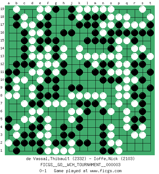 Last move : 0-1 2009 January 26 16:1:43 [Event "FICGS__GO__WCH_TOURNAMENT__000003"] [Site "FICGS"] [Date "2008.07.08"] [Round "1"] [Black "de Vassal,Thibault"] [White "Ioffe,Nick"] [Result "0-1"] [Rating 1 "2332"] [Rating 2 "2103"] 1.q16 r3 2.c16 d5 3.d3 e3 4.e2 f2 5.e1 f3 6.d4 f5 7.k4 c5 8.e4 f4 9.e5 e6 10.b2 f1 11.c2 k6 12.n4 q6 13.r8 o3 14.n3 o4 15.n6 p8 16.r11 e16 17.h16 e13 18.c13 c17 19.b17 c18 20.b18 d16 21.c15 c10 22.f17 e18 23.e17 d17 24.f16 d14 25.c14 o17 26.m17 r17 27.r16 q17 28.p16 s17 29.o16 o18 30.d7 d6 31.e7 f7 32.e9 e10 33.f8 g7 34.f10 e11 35.f11 f12 36.h11 h13 37.k11 k13 38.g8 h7 39.h3 c7 40.m11 m13 41.l15 o13 42.q13 p11 43.s16 n16 44.f18 r10 45.s10 q11 46.r12 n8 47.m7 m8 48.l7 l8 49.k7 k8 50.j9 d8 51.e8 d9 52.g9 j8 53.k9 j2 54.l2 j5 55.k5 j6 56.j3 o2 57.h2 h1 58.n2 k18 59.l17 n19 60.m18 m19 61.l18 l19 62.s6 s4 63.n15 n17 64.m15 m12 65.b12 p14 66.o14 p13 67.p17 p18 68.a10 b9 69.a9 b8 70.a5 a8 71.b11 b4 72.a4 b3 73.c3 c1 74.b1 d1 75.d2 a2 76.r5 q5 77.r4 q4 78.s5 s3 79.e14 f14 80.e15 d15 81.f15 d13 82.t17 t18 83.t16 s19 84.n11 q10 85.r9 n7 86.l6 o6 87.o1 p1 88.n1 p2 89.g14 f13 90.g13 g12 91.h12 h14 92.g15 k14 93.d12 d11 94.c12 g11 95.g10 e12 96.o10 p9 97.p10 o11 98.n10 q9 99.l12 l13 100.n12 n13 101.k17 r14 102.q14 p15 103.j18 q15 104.r15 k19 105.o12 p12 106.j19 f19 107.g19 e19 108.n18 o19 109.j16 b10 110.m16 q18 111.a11 b19 112.q7 p7 113.g2 g1 114.k2 r7 115.s7 q8 116.h4 s9 117.s8 s11 118.t9 r13 119.s12 q12 120.s13 s14 121.o15 t13 122.t11 j1 0-1 Here are the names of the openings (joseki) played in the four corners : Corner d4 : d5 d3 Takamoku (Gomok, Gaomu`) 5-4 Point. The takamoku (high) point (5-4). With its emphasis on influence, the 5-4 point complements the 4-4 (hoshi) point in creating an influence-oriented fuseki. Komoku. White responds with 3-3, 3-5, 4-6, 4-7, 3-6, 3-7. Corner q4 : r3 n4 San-San (Sam-Sam, San-San) 3-3 Point. The San-San (3-3) point, emphasizing territory at the expense of influence. Corner d16 : c16 e16 Komoku (Somok, Xiao~mu`) 3-4 Point. The komoku (3-4) point is the traditional corner enclosure move.. Ikken Takagakari (Hankan Nop'dakeolch'im, Yi Gaogua`jiao~, 1-Space High Approach). The 5-4 approach move has become more popular in modern times, as modern Go emphasizes speed and influence. Player White won this Go (weiqi, baduk) game. Follow this game move after move (download)It is difficult to know exactly what you are doing. (Pierre Audouard) A good aphorism is too hard for the tooth of time, and is not worn away with the centuries, although it serves as food for every speech. (Friedrich Nietzsche)