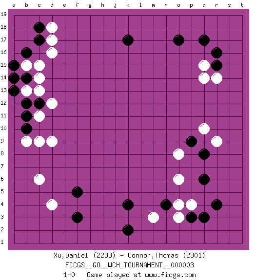 Last move : 1-0 2008 October 17 12:7:5 [Event "FICGS__GO__WCH_TOURNAMENT__000003"] [Site "FICGS"] [Date "2008.07.08"] [Round "1"] [Black "Xu,Daniel"] [White "Connor,Thomas"] [Result "1-0"] [Rating 1 "2233"] [Rating 2 "2301"] 1.r4 d4 2.q17 d16 3.f3 c6 4.k4 q15 5.r15 r14 6.r16 q14 7.o17 q10 8.q8 p4 9.p3 o3 10.q3 o6 11.n4 o4 12.q6 o8 13.f5 d9 14.b16 c15 15.c17 d17 16.b14 b15 17.a15 c13 18.b12 b13 19.a13 c14 20.a14 d18 21.c18 c11 22.b10 c9 23.c12 d12 24.b11 b9 25.k17 r9 26.p9 m3 27.k2 1-0 This go game has been lost on time (started : 2008.07.08 16:52:56) Here are the names of the openings (joseki) played in the four corners : Corner d4 : d4 f3 Hoshi (Hwajeom, Seongjeom, Xingwei`) 4-4 Point. The star or hoshi (4-4) point, emphasizing influence at the potential expense of territory. Ikken Kakari (Hankan Keolch'im, Yi Gua`jiao~, 1-Space Low Approach). Black 2 is the standard approach move to the 4-4. Corner q16 : q17 q15 Komoku (Somok, Xiao~mu`) 3-4 Point. The komoku (3-4) point is the traditional corner enclosure move.. Ikken Takagakari (Hankan Nop'dakeolch'im, Yi Gaogua`jiao~, 1-Space High Approach). The 5-4 approach move has become more popular in modern times, as modern Go emphasizes speed and influence. Corner d16 : d16 b16 Hoshi (Hwajeom, Seongjeom, Xingwei`) 4-4 Point. The star or hoshi (4-4) point, emphasizing influence at the potential expense of territory. Player Black won this Go (weiqi, baduk) game. Follow this game move after move (download)Don't be greedy ! (Anonymous) If you have any trouble condescending, find a Unix user to show you how it's done. (Scott Adams)