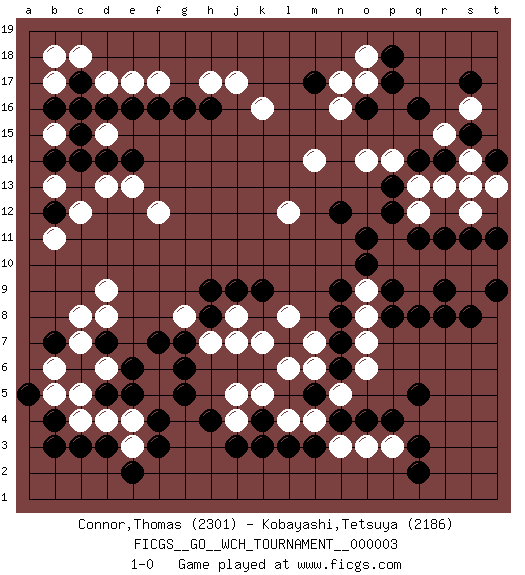 Last move : 1-0 2009 January 11 10:25:38 [Event "FICGS__GO__WCH_TOURNAMENT__000003"] [Site "FICGS"] [Date "2008.07.08"] [Round "1"] [Black "Connor,Thomas"] [White "Kobayashi,Tetsuya"] [Result "1-0"] [Rating 1 "2301"] [Rating 2 "2186"] 1.q16 d17 2.q3 d4 3.c6 d9 4.c3 c4 5.d3 e4 6.b4 b5 7.b3 c5 8.f3 o17 9.r14 k16 10.c14 c12 11.c17 c16 12.d16 d15 13.e16 b17 14.c15 c18 15.e14 e17 16.f16 f17 17.g16 h17 18.q5 d13 19.d14 f12 20.b12 b11 21.f4 f5 22.g5 f6 23.h4 p3 24.p4 o3 25.q2 n5 26.m3 m4 27.l3 k5 28.k4 j5 29.g6 j4 30.j3 l4 31.k3 n3 32.f7 d6 33.q8 r10 34.r8 r13 35.q14 s14 36.s15 q13 37.p13 s12 38.t14 s13 39.p12 s9 40.s8 p10 41.m17 p14 42.o16 o14 43.n12 m14 44.p17 l12 45.o10 o9 46.p9 p11 47.n9 o8 48.n8 o7 49.k9 j7 50.o11 q9 51.p8 q12 52.r9 q10 53.n7 o6 54.h9 j8 55.j9 g8 56.h8 h7 57.g7 m6 58.l7 l6 59.o4 k7 60.n4 e13 61.b16 b15 62.c17 e3 63.e2 c16 64.h16 j17 65.c17 n17 66.c16 n16 67.m5 l8 68.n6 m7 69.p18 o18 70.r11 s10 71.d7 c7 72.e6 d8 73.d5 b6 74.e5 b18 75.b14 b13 76.b7 d6 77.t9 t13 78.c6 c8 79.a5 d6 80.t11 t10 81.c6 s16 82.s17 d6 83.s11 r15 84.q11 1-0 Here are the names of the openings (joseki) played in the four corners : Corner d4 : d4 c6 Hoshi (Hwajeom, Seongjeom, Xingwei`) 4-4 Point. The star or hoshi (4-4) point, emphasizing influence at the potential expense of territory. Ikken Kakari (Hankan Keolch'im, Yi Gua`jiao~, 1-Space Low Approach). Black 2 is the standard approach move to the 4-4. Corner q16 : q16 o17 Hoshi (Hwajeom, Seongjeom, Xingwei`) 4-4 Point. The star or hoshi (4-4) point, emphasizing influence at the potential expense of territory. Ikken Kakari (Hankan Keolch'im, Yi Gua`jiao~, 1-Space Low Approach). White 2 is the standard approach move to the 4-4. Corner d16 : d17 c14 Komoku (Somok, Xiao~mu`) 3-4 Point. The komoku (3-4) point is the traditional corner enclosure move.. Nikken Kakari (Dukan Keolch'im, E`r Gua`jiao~, 2-Space Low Approach). Black 2 is used with friendly forces backing it up. Its purpose is to prevent a pincer. Locally it results in a loss, but may be appropriate fuseki strategy. It was popular in the late 1950s and early 1960s, but is not seen often nowadays, having been replaced by the one-space high approach, with which it has points in common. Player Black won this Go (weiqi, baduk) game. Follow this game move after move (download)Atari, atari is vulgar play. (Anonymous) To steal ideas from one person is plagiarism. To steal from many is research. (Unknown)