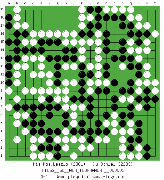 Last move : 0-1 2008 December 31 15:40:40 [Event "FICGS__GO__WCH_TOURNAMENT__000003"] [Site "FICGS"] [Date "2008.07.08"] [Round "1"] [Black "Kis-Kos,Laszlo"] [White "Xu,Daniel"] [Result "0-1"] [Rating 1 "2301"] [Rating 2 "2233"] 1.r16 c4 2.q3 d16 3.p17 r10 4.r12 r7 5.r5 k17 6.e4 k3 7.d6 e3 8.f3 d3 9.f4 c6 10.c7 b6 11.d7 n3 12.c14 f16 13.b16 c17 14.c11 e13 15.m17 k15 16.s9 s10 17.r8 q8 18.s7 r9 19.s8 r14 20.q13 q14 21.o13 s12 22.e15 d15 23.f15 g16 24.g15 h16 25.d14 e11 26.e14 h12 27.j14 k14 28.j13 l12 29.k11 h10 30.k9 h8 31.m4 m3 32.j4 j12 33.k12 k13 34.g13 j7 35.k4 m13 36.k8 m10 37.p14 e9 38.p9 p12 39.p13 p8 40.n9 r13 41.q12 s15 42.q9 o5 43.l6 p2 44.o8 s17 45.g7 g8 46.f7 c9 47.d10 d9 48.e10 f10 49.c10 b8 50.q2 p3 51.j2 q4 52.r4 k2 53.p6 o6 54.o7 j3 55.h3 h2 56.g2 j1 57.e2 d2 58.h6 q18 59.p18 r17 60.q16 l18 61.m18 b17 62.c16 e16 63.l16 j15 64.g12 f11 65.g11 j10 66.l11 m11 67.m9 b12 68.b13 c12 69.d12 d11 70.f13 e12 71.a17 c15 72.b15 a16 73.a13 b10 74.a15 b18 75.n12 m12 76.s16 t16 77.n15 q5 78.q6 r2 79.r3 q1 80.s2 r1 81.s1 p1 82.r11 s11 83.q10 k7 84.l7 e1 85.f2 h4 86.h5 g3 87.g4 h3 88.p5 p4 89.k16 j16 90.n6 n5 91.m5 d5 92.e5 j5 93.k5 j6 94.f6 m15 95.l17 k18 96.n14 m14 97.q17 r18 98.n11 t9 99.t8 t10 100.q7 n10 101.o10 l10 102.k10 l9 103.l8 n19 104.m19 p19 105.n18 o19 106.o18 q19 107.r15 s14 108.g10 g9 109.l19 k19 110.a18 b19 111.a12 b11 112.b7 a7 113.f8 f9 114.a11 d13 115.d4 b3 116.c5 b5 117.n4 o4 118.h13 h7 119.a10 a9 120.l3 l2 121.l4 m16 122.n16 q15 123.p15 h15 124.h14 c13 125.b14 e8 126.e7 l15 127.d5 f1 128.g1 d1 129.j8 h9 130.pass pass 131.pass pass 132.pass 0-1 Here are the names of the openings (joseki) played in the four corners : Corner q4 : q3 r7 Komoku (Somok, Xiao~mu`) 3-4 Point. The komoku (3-4) point is the traditional corner enclosure move.. Corner d4 : c4 e4 Komoku (Somok, Xiao~mu`) 3-4 Point. The komoku (3-4) point is the traditional corner enclosure move.. Ikken Takagakari (Hankan Nop'dakeolch'im, Yi Gaogua`jiao~, 1-Space High Approach). The 5-4 approach move has become more popular in modern times, as modern Go emphasizes speed and influence. Corner d16 : d16 c14 Hoshi (Hwajeom, Seongjeom, Xingwei`) 4-4 Point. The star or hoshi (4-4) point, emphasizing influence at the potential expense of territory. Ikken Kakari (Hankan Keolch'im, Yi Gua`jiao~, 1-Space Low Approach). Black 2 is the standard approach move to the 4-4. Player White won this Go (weiqi, baduk) game. Follow this game move after move (download)Those who are good at winning, don't usually fight. (Zhang) A married woman is like a fish riding a bicycle. (Rodolfo d'Ettorre)