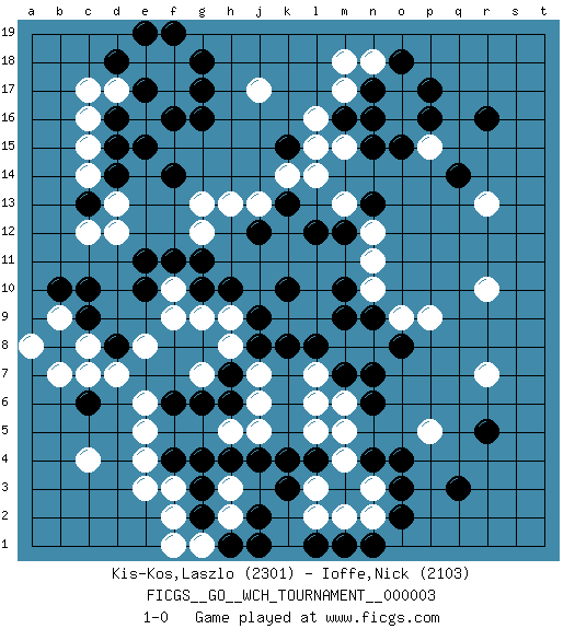 Last move : 1-0 2008 December 12 8:46:55 [Event "FICGS__GO__WCH_TOURNAMENT__000003"] [Site "FICGS"] [Date "2008.07.08"] [Round "1"] [Black "Kis-Kos,Laszlo"] [White "Ioffe,Nick"] [Result "1-0"] [Rating 1 "2301"] [Rating 2 "2103"] 1.r16 d17 2.q3 c4 3.p17 e3 4.d15 d12 5.g16 f17 6.g17 c15 7.d16 c16 8.f16 f18 9.d14 c14 10.r5 r10 11.j4 p5 12.o4 p15 13.q14 o17 14.p16 o16 15.o15 l16 16.g18 e16 17.f14 l14 18.n15 j17 19.n17 n18 20.o18 m17 21.m16 m15 22.n16 m18 23.c10 c8 24.c13 c12 25.e15 d13 26.e17 e18 27.d18 c17 28.e19 e16 29.c6 e8 30.b8 b9 31.c9 b7 32.d8 c7 33.e17 d7 34.f19 j6 35.b10 a8 36.e10 g9 37.g10 h9 38.k15 l15 39.l12 g12 40.h10 f10 41.f11 f9 42.e11 g13 43.g11 j13 44.k10 m8 45.k8 l6 46.n6 m6 47.n7 n8 48.m7 l7 49.l8 n11 50.n13 m13 51.m12 n12 52.m10 n10 53.o8 o9 54.k13 k14 55.j12 h13 56.j9 r7 57.n9 r13 58.m9 p9 59.f4 f3 60.h7 h5 61.g4 l3 62.f6 n2 63.j2 h3 64.h4 e5 65.g6 j7 66.j8 h8 67.l4 m4 68.k3 l2 69.g3 f2 70.o2 n3 71.o3 h2 72.g2 g1 73.j1 e4 74.h1 l5 75.k4 f1 76.n4 e6 77.m3 m5 78.n1 m2 79.m1 g7 80.h6 j5 81.l1 1-0 Here are the names of the openings (joseki) played in the four corners : Corner d16 : d17 d15 Komoku (Somok, Xiao~mu`) 3-4 Point. The komoku (3-4) point is the traditional corner enclosure move.. Ikken Takagakari (Hankan Nop'dakeolch'im, Yi Gaogua`jiao~, 1-Space High Approach). The 5-4 approach move has become more popular in modern times, as modern Go emphasizes speed and influence. Player Black won this Go (weiqi, baduk) game. Follow this game move after move (download)Extend one hand from the cutting points. (Anonymous) The Internet is so big, so powerful and pointless that for some people it is a complete substitute for life. (Andrew Brown)