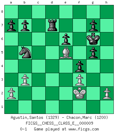 Last move : 0-1 2006 August 11 18:14:42 [Event "FICGS__CHESS__CLASS_E__000009"] [Site "FICGS"] [Date "2006.07.26"] [Round "1"] [White "Agustin,Santos"] [Black "Chacon,Marc"] [Result "0-1"] [WhiteElo "1329"] [BlackElo "1200"] 1.d4 d5 2.Nf3 Bf5 3.g3 Nf6 4.Bg2 Nc6 5.O-O Qd7 6.Bf4 Bh3 7.Bxh3 Qxh3 8.Bxc7 Rc8 9.Bf4 Ne4 10.Nbd2 e6 11.Nxe4 dxe4 12.Ng5 Qf5 13.c4 h6 14.d5 Nd8 15.Qa4+ Ke7 16.d6+ Kf6 17.Qc2 hxg5 18.Qc3+ Kg6 19.d7 Qh3 20.g4 Qxg4+ 21.Bg3 Rc6 22.Rad1 Bd6 23.f3 Bc5+ 24.Rf2 Bxf2+ 25.Kxf2 exf3 26.exf3 Qxc4 27.Qxc4 Rxc4 28.Rd2 f5 29.b3 Rc6 30.Be5 f4 31.Kg2 Nf7 32.Bb2 Rd8 33.Kf2 Rd6 34.Rxd6 Nxd6 35.Bd4 Nb5 36.Be5 Rxd7 0-1 Queen's pawn game Kingside Castling by player White (move 5) Player Black won this chess game. Follow this game move after move (download)A man that will take back a move at Chess will pick a pocket. (Richard Fenton) Ich liebe den Moment, wenn ich das Ego meines Gegenüber breche. (Robert James Fischer) Si el ingenio solamente fuese necesario para lucirse, las mujeres serían las mejores jugadoras de Ajedrez del mundo. (Albin) Que feriez-vous si vous étiez en train de jouer aux échecs et que la fin du monde arrive ? Je continuerais à jouer. (Saint Borromée) Success without honor is an unseasoned dish; it will satisfy your hunger, but it won't taste good. (Joe Paterno)
