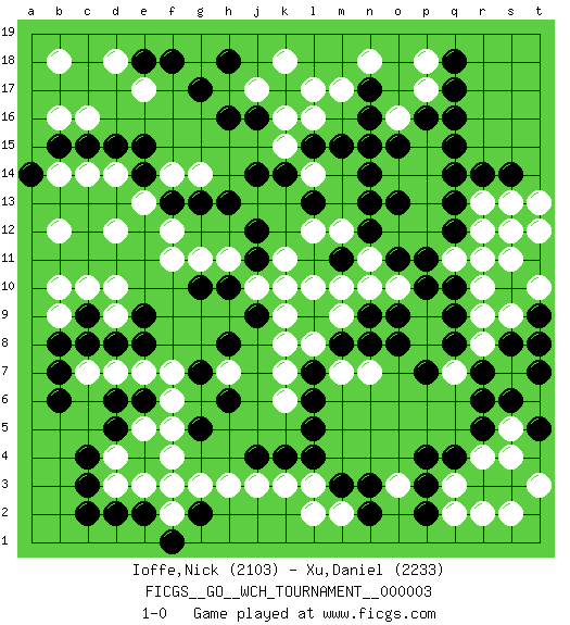 Last move : 1-0 2009 January 4 12:18:52 [Event "FICGS__GO__WCH_TOURNAMENT__000003"] [Site "FICGS"] [Date "2008.07.08"] [Round "1"] [Black "Ioffe,Nick"] [White "Xu,Daniel"] [Result "1-0"] [Rating 1 "2103"] [Rating 2 "2233"] 1.q16 c16 2.q4 d3 3.q10 e17 4.d5 o3 5.m3 q3 6.r3 r4 7.r5 s4 8.p3 q2 9.p4 s5 10.p2 r2 11.r6 l3 12.l4 k3 13.k4 j3 14.j4 h3 15.k17 r8 16.s6 r12 17.r14 r10 18.q9 r9 19.q8 q11 20.p11 p12 21.o11 s13 22.s14 d10 23.e9 d9 24.e8 c7 25.c3 d4 26.c4 e5 27.d6 f11 28.g10 g11 29.h10 l10 30.j12 l12 31.n13 o12 32.n12 n11 33.o9 n10 34.m8 l8 35.l7 k8 36.h8 k7 37.l6 m9 38.n9 l14 39.n15 l16 40.j14 m17 41.g17 p17 42.q17 p18 43.q18 o14 44.o13 p13 45.o15 p15 46.p16 o16 47.n14 p14 48.l15 k15 49.m15 k16 50.n17 n18 51.k14 m12 52.h16 j17 53.l13 k11 54.j16 k18 55.e15 d14 56.e14 e13 57.f13 f12 58.d15 c14 59.c15 b16 60.b15 b14 61.a14 d12 62.e18 d18 63.f18 b18 64.f3 f2 65.g2 g3 66.e2 f4 67.d2 e3 68.f1 f3 69.c2 m2 70.n3 f14 71.g13 g14 72.h13 b12 73.g5 f5 74.n2 l2 75.q13 r13 76.q14 s11 77.q12 r11 78.t9 t8 79.s8 s9 80.t7 t10 81.t8 h11 82.j11 j10 83.h6 q7 84.r7 e7 85.j9 k9 86.k10 m7 87.n8 j10 88.s3 s2 89.k10 o10 90.p10 j10 91.t5 t3 92.k10 p8 93.q15 j10 94.m11 m10 95.k10 p9 96.p7 j10 97.t12 t13 98.k10 n7 99.o8 j10 100.t11 s12 101.k10 k6 102.l5 j10 103.t11 t12 104.k10 h7 105.g7 j10 106.d8 k10 107.c8 d7 108.e6 f6 109.b6 f7 110.b7 b9 111.c9 c10 112.b8 b10 113.n16 l17 114.h18 1-0 Here are the names of the openings (joseki) played in the four corners : Corner d4 : d3 d5 Komoku (Somok, Xiao~mu`) 3-4 Point. The komoku (3-4) point is the traditional corner enclosure move.. Ikken Takagakari (Hankan Nop'dakeolch'im, Yi Gaogua`jiao~, 1-Space High Approach). The 5-4 approach move has become more popular in modern times, as modern Go emphasizes speed and influence. Corner q4 : q4 o3 Hoshi (Hwajeom, Seongjeom, Xingwei`) 4-4 Point. The star or hoshi (4-4) point, emphasizing influence at the potential expense of territory. Ikken Kakari (Hankan Keolch'im, Yi Gua`jiao~, 1-Space Low Approach). White 2 is the standard approach move to the 4-4. Corner q16 : q16 r12 Hoshi (Hwajeom, Seongjeom, Xingwei`) 4-4 Point. The star or hoshi (4-4) point, emphasizing influence at the potential expense of territory. Player Black won this Go (weiqi, baduk) game. Follow this game move after move (download)Use a wall to attack, not to make territory. (Anonymous) Wipe them out. All of them. (Darth Sidious in Star Wars ep.1)