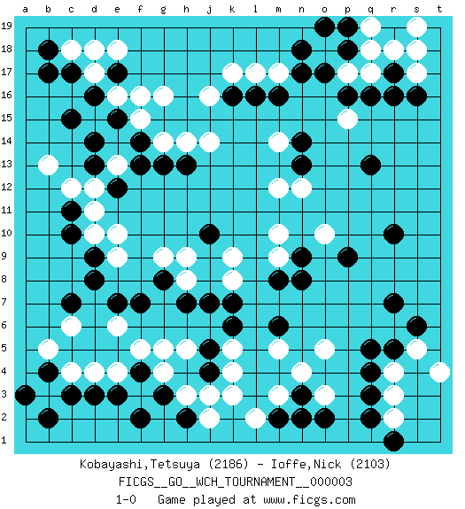 Last move : 1-0 2008 September 27 0:1:4 [Event "FICGS__GO__WCH_TOURNAMENT__000003"] [Site "FICGS"] [Date "2008.07.08"] [Round "1"] [Black "Kobayashi,Tetsuya"] [White "Ioffe,Nick"] [Result "1-0"] [Rating 1 "2186"] [Rating 2 "2103"] 1.r16 d17 2.q3 c4 3.c15 d12 4.d14 g16 5.b17 c18 6.o17 m17 7.e3 h3 8.c10 b13 9.d16 e16 10.c17 d18 11.e15 f15 12.f14 g14 13.f13 d10 14.c7 e4 15.d9 e10 16.c11 e9 17.d8 e13 18.d13 c12 19.e12 d11 20.f7 h9 21.d3 d4 22.c3 b3 23.b2 b5 24.a3 f3 25.b4 c6 26.h7 k9 27.g13 h14 28.e17 f16 29.f4 g5 30.g3 g4 31.f2 f5 32.h2 j3 33.j10 h8 34.j7 k8 35.j5 h5 36.g8 g9 37.j4 k3 38.k7 k5 39.k6 e6 40.e7 k4 41.m6 o3 42.q5 o5 43.m8 m9 44.n9 m10 45.h13 j14 46.r10 p15 47.m16 l17 48.n17 q17 49.q16 p17 50.p16 s17 51.r17 r18 52.s16 o18 53.n18 s18 54.p19 q19 55.p18 q18 56.o19 s19 57.l16 k17 58.k16 j16 59.q13 m14 60.n14 m12 61.n13 n12 62.n8 o10 63.p9 r4 64.q4 r3 65.r5 r2 66.q2 s5 67.s6 t4 68.r7 j2 69.m2 m3 70.o2 l2 71.n3 n4 72.n2 m5 73.b18 e18 74.r1 1-0 Here are the names of the openings (joseki) played in the four corners : Corner d16 : d17 c15 Komoku (Somok, Xiao~mu`) 3-4 Point. The komoku (3-4) point is the traditional corner enclosure move.. Ikken Kakari (Hankan Keolch'im, Yi Gua`jiao~, 1-Space Low Pincer). The small knight move is the basic approach move to the 3-4 point stone. It has been continually used for over four centuries. There are limitless variations, with new moves constantly being discovered. Black 2 opens the door to a treaure store of joseki. Corner d4 : c4 e3 Komoku (Somok, Xiao~mu`) 3-4 Point. The komoku (3-4) point is the traditional corner enclosure move.. Ikken Kakari (Hankan Keolch'im, Yi Gua`jiao~, 1-Space Low Pincer). The small knight move is the basic approach move to the 3-4 point stone. It has been continually used for over four centuries. There are limitless variations, with new moves constantly being discovered. Black 2 opens the door to a treaure store of joseki. Player Black won this Go (weiqi, baduk) game. Follow this game move after move (download)Keep inessential ataris till the end. (Anonymous) I can't decide which is riskier; taking crazy risks, or taking advice on crazy risks from a crazy risk taker. (Gregory House in House M.D.)