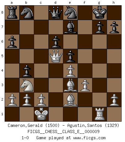 Last move : 1-0 2006 August 15 21:12:21 [Event "FICGS__CHESS__CLASS_E__000009"] [Site "FICGS"] [Date "2006.07.26"] [Round "1"] [White "Cameron,Gerald"] [Black "Agustin,Santos"] [Result "1-0"] [WhiteElo "1500"] [BlackElo "1329"] 1.e4 c5 2.Nf3 d6 3.d4 cxd4 4.Nxd4 Nf6 5.Nc3 a6 6.Be3 e5 7.Nb3 b5 8.f3 Bb7 9.Qd2 Be7 10.O-O-O O-O 11.g4 Ne8 12.g5 f5 13.gxf6 Rxf6 14.Be2 Rg6 15.Rhg1 Rxg1 16.Rxg1 b4 17.Nd5 Bxd5 18.Qxd5+ 1-0 Sicilian : Najdorf, Byrne (English) attack Queenside Castling by player White (move 10) Kingside Castling by player Black (move 10) Player White won this chess game. Follow this game move after move (download)There just isn't enough televised Chess. (David Letterman) Kein Großmeister ist normal. Sie unterscheiden sich nur im Ausmaß Ihrer Verrücktheit. (Viktor Kortschnoi) No es suficiente ser un buen jugador, se debe también de jugar bién. (Siegbert Tarrasch) Les écrivains ont utilisé les échecs pour analyser les côtés extrêmes de la nature humaine. Dans ce cadre, les échecs offrent un champ d'expérimentation idéal. Mais on pourrait faire la même chose avec la peinture. Et là, en vous référant à Van Gogh, vous ne tirerez pas de conclusion définitive sur les peintres. (Gary Kasparov) Life is verb, not a noun. (Charlotte Perkins Gilman)