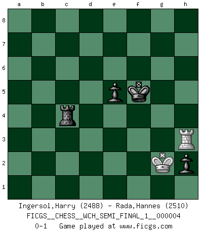 Last move : 0-1 2008 December 21 23:59:28 [Event "FICGS__CHESS__WCH_SEMI_FINAL_1__000004"] [Site "FICGS"] [Date "2008.07.10"] [Round "6"] [White "Ingersol,Harry"] [Black "Rada,Hannes"] [Result "0-1"] [WhiteElo "2488"] [BlackElo "2510"] 1.Nf3 c5 2.c4 g6 3.d4 cxd4 4.Nxd4 Nc6 5.e4 Bg7 6.Be3 Nf6 7.Nc3 Ng4 8.Qxg4 Nxd4 9.Qd1 Nc6 10.Rc1 d6 11.Be2 O-O 12.O-O Qa5 13.a3 Be6 14.Qd2 Rac8 15.Rfd1 f5 16.exf5 Bxf5 17.Qe1 Be6 18.f4 Rf7 19.Rd2 Rcf8 20.g3 g5 21.Nd5 Bh3 22.Bh5 Rf5 23.g4 Rxd5 24.Rxd5 Qxe1+ 25.Rxe1 gxf4 26.Bf2 Ne5 27.Re2 Nf3+ 28.Kh1 Ne5 29.Bxa7 f3 30.Rc2 Nxg4 31.Bxg4 Bxg4 32.Kg1 Rf4 33.Kf2 Bf5 34.Rc1 Be5 35.Re1 Be4 36.Rxe4 Rxe4 37.b3 Rh4 38.Rb5 Rxh2+ 39.Kxf3 h5 40.Bf2 h4 41.Rxb7 h3 42.Rxe7 Rg2 43.Re6 Rg7 44.Rh6 Rf7+ 45.Ke2 h2 46.Rh3 Rh7 47.Bh4 Kf7 48.Kf1 Rh8 49.b4 Ra8 50.Bf2 Rxa3 51.Rh4 Ra4 52.Kg2 Rxb4 53.Bd4 Rxc4 54.Rh7+ Kg6 55.Bxe5 dxe5 56.Rh3 Kf5 0-1 Reti Opening Kingside Castling by player Black (move 11) Kingside Castling by player White (move 12) 10 pieces endgame at move 50 : White KRBPP , Black KRBPP WHITE : King + 1 Rook 1 Bishop 2 Pawns BLACK : King + 1 Rook 1 Bishop 2 Pawns 9 pieces endgame at move 52 : White KRBP , Black KRBPP WHITE : King + 1 Rook 1 Bishop 1 Pawn BLACK : King + 1 Rook 1 Bishop 2 Pawns 8 pieces endgame at move 53 : White KRB , Black KRBPP WHITE : King + 1 Rook 1 Bishop BLACK : King + 1 Rook 1 Bishop 2 Pawns 7 pieces endgame at move 55 : White KRB , Black KRPP WHITE : King + 1 Rook 1 Bishop BLACK : King + 1 Rook 2 Pawns 6 pieces endgame at move 55 : White KR , Black KRPP WHITE : King + 1 Rook BLACK : King + 1 Rook 2 Pawns Player Black won this chess game. Follow this game move after move (download)All my games are real. (Bobby Fischer) Wenn ich Weiß habe gewinne ich weil ich Weiß habe, wenn ich Schwarz habe gewinne ich weil ich Bogoljubov bin. (Efim Bogoljubov) Yo no le temo a Spassky. Todos saben que yo soy el mejor. Uno no necesita un torneo para probarlo. (Bobby Fischer) Les échecs, c'est l'art d'analyser. (Mikhail Botvinnik) They say in chess you've got to kill the queen, and then you mate it... Oh I, do you ? (Red Hot Chili Peppers, Fortune faded)