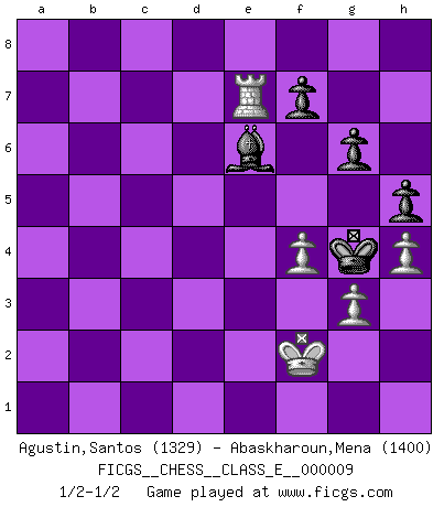 Last move : 1/2-1/2 2006 August 19 21:39:26 [Event "FICGS__CHESS__CLASS_E__000009"] [Site "FICGS"] [Date "2006.07.26"] [Round "1"] [White "Agustin,Santos"] [Black "Abaskharoun,Mena"] [Result "1/2-1/2"] [WhiteElo "1329"] [BlackElo "1400"] 1.d4 Nf6 2.c4 e5 3.Nc3 exd4 4.Qxd4 Nc6 5.Qd1 Bb4 6.Nf3 O-O 7.Bd2 Re8 8.e3 d5 9.cxd5 Nxd5 10.Nxd5 Qxd5 11.Bxb4 Nxb4 12.Qxd5 Nxd5 13.Bc4 Nb6 14.Bb3 Bf5 15.O-O Rad8 16.Rad1 a5 17.Rxd8 Rxd8 18.Rc1 a4 19.Bd1 Nc4 20.Nd4 Nxb2 21.Be2 Be6 22.Rxc7 Bxa2 23.Rxb7 Nc4 24.h3 g6 25.Bxc4 Bxc4 26.Rb4 Rxd4 27.exd4 Bb3 28.Kf1 Kf8 29.d5 Bxd5 30.Rxa4 Ke7 31.g3 Ke6 32.Ra7 Ke5 33.f4+ Ke4 34.Kf2 h6 35.Re7+ Be6 36.Ke2 h5 37.h4 Kf5 38.Ke3 Kg4 39.Kf2 1/2-1/2 Budapest defense declined Kingside Castling by player Black (move 6) Kingside Castling by player White (move 15) 10 pieces endgame at move 30 : White KRPPP , Black KBPPP WHITE : King + 1 Rook 3 Pawns BLACK : King + 1 Bishop 3 Pawns This chess game ended in a draw. Follow this game move after move (download)A bad plan is better than none at all. (Frank Marshall) Fischer machte Schach einfach zu einer aufregenden Sache, wann immer er sich ans Brett setzte. (Raymond Keene) Una buena memoria, concentración, imaginación y una fuerte voluntad, se requiere para llegar a ser un buen jugador. (Bobby Fischer) Il a essayé de se convaincre qu'il pourrait empêcher toutes les erreurs et ne jamais perdre. L'horreur ! Gary Kasparov au sujet de Robert Fischer. When you have everything, sometimes it feels like nothing. (Horatio Caine, C.S.I. Miami)