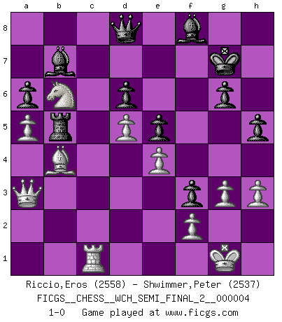 Last move : 1-0 2008 September 7 12:8:19 [Event "FICGS__CHESS__WCH_SEMI_FINAL_2__000004"] [Site "FICGS"] [Date "2008.07.10"] [Round "7"] [White "Riccio,Eros"] [Black "Shwimmer,Peter"] [Result "1-0"] [WhiteElo "2558"] [BlackElo "2537"] 1.e4 Nc6 2.Nf3 e5 3.Bb5 a6 4.Ba4 Nf6 5.O-O Be7 6.Re1 b5 7.Bb3 O-O 8.h3 d6 9.c3 Na5 10.Bc2 c5 11.d4 Qc7 12.Nbd2 cxd4 13.cxd4 Bb7 14.d5 Rac8 15.Bd3 Nd7 16.Nf1 f5 17.Ng3 f4 18.Nf5 Bd8 19.b3 g6 20.Nh6+ Kg7 21.Ng4 h5 22.Ngh2 Qb6 23.Bd2 Nc5 24.Bc2 Nd7 25.Rc1 Ba8 26.Qe2 Bf6 27.Bd3 Nc5 28.b4 Nxd3 29.Rxc8 Nxe1 30.bxa5 Nxf3+ 31.Nxf3 Qa7 32.Rc1 Rf7 33.Bb4 Qb8 34.Qc2 Rd7 35.a4 Be7 36.Nd2 bxa4 37.Qxa4 Rb7 38.Ba3 Rb5 39.Nc4 Qd8 40.Nb6 Bb7 41.Bb4 f3 42.Qa3 Bf8 43.g3 1-0 KP : Nimzovich defense Kingside Castling by player White (move 5) Kingside Castling by player Black (move 7) Player White won this chess game. Follow this game move after move (download)Chess is a fairy tale of 1001 blunders. (Savielly Tartakower) Wenn sie aufgeben, dann danke ich Ihnen für das Spiel (Eventualzug beim Fernschach). (Anonymous) Aquel que teme a un Peón de Reina aislado, debería de retirarse del Ajedrez. (Siegbert Tarrasch) Les erreurs sont comme les malheurs, elles n'arrivent jamais seules. (Siegbert Tarrasch) Methinks King Thibault should dub Marius Zubac a knight of the square board... I mean table, henceforth addressing him as Sir Marius, and bestow on him a suitable land from the kingdom of FICGS & marry him off to a worthy, fair maiden, lest he slice our heads with his mighty sword in his wrath. (Dinesh De Silva)