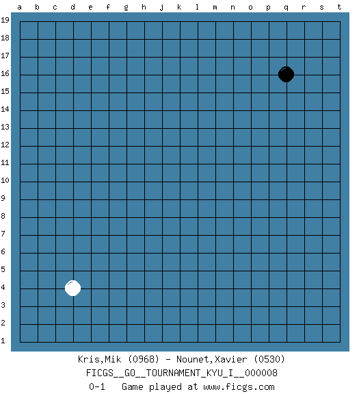 Last move : 0-1 2008 August 13 5:57:38 [Event "FICGS__GO__TOURNAMENT_KYU_I__000008"] [Site "FICGS"] [Date "2008.07.11"] [Round "1"] [Black "Kris,Mik"] [White "Nounet,Xavier"] [Result "0-1"] [Rating 1 "0968"] [Rating 2 "0530"] 1.q16 d4 0-1 This go game has been lost on time (started : 2008.07.11 11:33:48) Here are the names of the openings (joseki) played in the four corners : Corner d4 : d4 0-1 Hoshi (Hwajeom, Seongjeom, Xingwei`) 4-4 Point. The star or hoshi (4-4) point, emphasizing influence at the potential expense of territory. Player White won this Go (weiqi, baduk) game. Follow this game move after move (download)The L-group is dead. (Anonymous) In my experience, there's no such thing as luck. (Obi-Wan Kenobi in Star Wars ep.4)