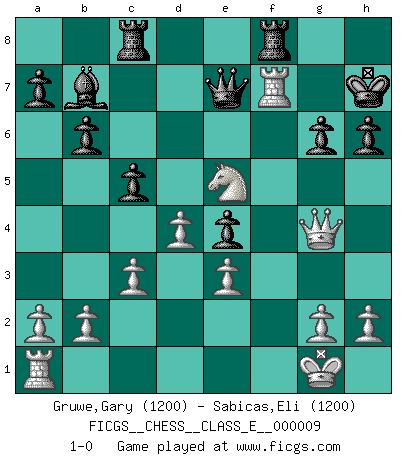 Last move : 1-0 2006 November 6 7:39:28 [Event "FICGS__CHESS__CLASS_E__000009"] [Site "FICGS"] [Date "2006.07.26"] [Round "1"] [White "Gruwe,Gary"] [Black "Sabicas,Eli"] [Result "1-0"] [WhiteElo "1200"] [BlackElo "1200"] 1.d4 d5 2.Nf3 e6 3.c3 Nf6 4.Bg5 Nbd7 5.e3 h6 6.Bh4 Be7 7.Nbd2 O-O 8.Bd3 c5 9.O-O b6 10.Ne5 Bb7 11.f4 Rc8 12.Ndf3 Ne4 13.Nxd7 Qxd7 14.Ne5 Qd8 15.Bxe7 Qxe7 16.Bxe4 dxe4 17.f5 exf5 18.Rxf5 g6 19.Qg4 Kh7 20.Rxf7+ 1-0 Queen's pawn game Kingside Castling by player Black (move 7) Kingside Castling by player White (move 9) Player White won this chess game. Follow this game move after move (download)Chess is the art of analysis. (Mikhail Botvinnik) Ein Buch ist ein Spiegel; wenn ein Affe hineinsieht, so kann kein Apostel heraus gucken. (Georg Christoph Lichtenberg) La captura del Rey enemigo es la finalidad pero no el primer objetivo de la partida. (William Steinitz) Toutes les manuvres exécutées sur une colonne ouverte ont pour but ultime l'intrusion définitive sur la septième ou la huitième rangée, en plein cur de la position ennemie. (Aaron Nimzovitch) The large trees attract high winds. (Chinese proverb)