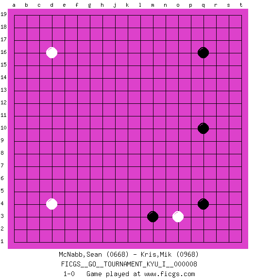 Last move : 1-0 2008 August 14 6:4:25 [Event "FICGS__GO__TOURNAMENT_KYU_I__000008"] [Site "FICGS"] [Date "2008.07.11"] [Round "1"] [Black "McNabb,Sean"] [White "Kris,Mik"] [Result "1-0"] [Rating 1 "0668"] [Rating 2 "0968"] 1.q16 d4 2.q4 d16 3.q10 o3 4.m3 1-0 This go game has been lost on time (started : 2008.07.11 11:33:48) Here are the names of the openings (joseki) played in the four corners : Corner q4 : q4 o3 Hoshi (Hwajeom, Seongjeom, Xingwei`) 4-4 Point. The star or hoshi (4-4) point, emphasizing influence at the potential expense of territory. Ikken Kakari (Hankan Keolch'im, Yi Gua`jiao~, 1-Space Low Approach). White 2 is the standard approach move to the 4-4. Player Black won this Go (weiqi, baduk) game. Follow this game move after move (download)Very few good moves are played. (Pierre Audouard) I fear not the man who has practiced 10,000 kicks once, but I fear the man who has practiced one kick 10,000 times. (Bruce Lee)