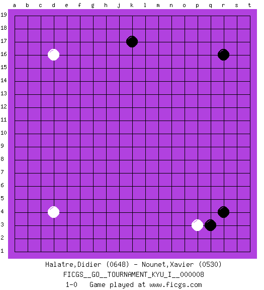 Last move : 1-0 2008 August 18 18:27:12 [Event "FICGS__GO__TOURNAMENT_KYU_I__000008"] [Site "FICGS"] [Date "2008.07.11"] [Round "1"] [Black "Halatre,Didier"] [White "Nounet,Xavier"] [Result "1-0"] [Rating 1 "0648"] [Rating 2 "0530"] 1.r4 d4 2.r16 d16 3.k17 p3 4.q3 1-0 This go game has been lost on time (started : 2008.07.11 11:33:48) Here are the names of the openings (joseki) played in the four corners : Corner q4 : r4 p3 Komoku (Somok, Xiao~mu`) 3-4 Point. The komoku (3-4) point is the traditional corner enclosure move.. Ikken Kakari (Hankan Keolch'im, Yi Gua`jiao~, 1-Space Low Pincer). The small knight move is the basic approach move to the 3-4 point stone. It has been continually used for over four centuries. There are limitless variations, with new moves constantly being discovered. White 2 opens the door to a treaure store of joseki. Player Black won this Go (weiqi, baduk) game. Follow this game move after move (download)Answer the keima with a kosumi. (Anonymous) The message for business people contemplating their place in the cyberspace is simple and direct: get linked or get lost. (Vic Sussman and Kenan Pollack)