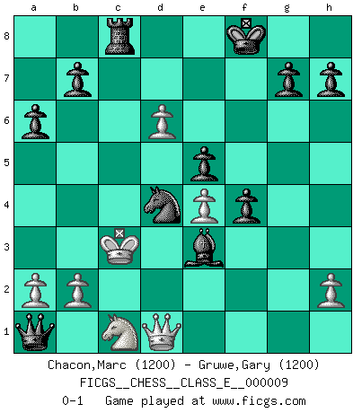 Last move : 0-1 2006 September 2 22:37:9 [Event "FICGS__CHESS__CLASS_E__000009"] [Site "FICGS"] [Date "2006.07.26"] [Round "1"] [White "Chacon,Marc"] [Black "Gruwe,Gary"] [Result "0-1"] [WhiteElo "1200"] [BlackElo "1200"] 1.d4 Nf6 2.c4 c5 3.Nf3 cxd4 4.Nxd4 e5 5.Nb5 d5 6.cxd5 Bc5 7.N1c3 a6 8.Na3 O-O 9.e4 Ng4 10.Be3 Nxe3 11.fxe3 Bxe3 12.Nc2 Ba7 13.Qd2 f5 14.d6 Be6 15.Ne3 f4 16.Ned5 Qh4 17.Kd1 Nc6 18.Nc7 Bg4 19.Be2 Rad8 20.Bxg4 Qxg4 21.Ne2 Qxg2 22.Rg1 Bxg1 23.Ne6 Qf1 24.Kc2 Qxa1 25.Nxf8 Kxf8 26.Nc1 Be3 27.Qd1 Nd4 28.Kc3 Rc8 0-1 Benoni defense Kingside Castling by player Black (move 8) Player Black won this chess game. Follow this game move after move (download)You must take your opponent into a deep dark forest where 2+2=5, and the path leading out is only wide enough for one. (Mikhail Tal) Das Schach hält seine Meister in eigenen Banden, Fesseln; auf vielerlei Weise formt es ihren Geist, so dass die innere Freiheit selbst des Stärksten beeinflusst wird. (Albert Einstein) Tu puedes aprender mucho mas de una partida que pierdas que de una partida ganada. Tendras que perder cientos de partidas antes de llegar a ser un buen jugador. (Jose Raul Capablanca) Assurément je connaissais par expérience le mystérieux attrait de ce jeu royal, le seul entre tous les jeux inventés par les hommes qui échappe souverainement à la tyrannie du hasard, le seul où l'on ne doive sa victoire qu'à son intelligence ou plutôt à une certaine forme d'intelligence. Mais n'est-ce pas déjà le limiter injurieusement que d'appeler les échecs un jeu ? N'est-ce pas une science, un art ou quelque chose qui, comme le cercueil de Mahomet entre ciel et terre, est suspendu entre l'un et l'autre, et qui réunit un nombre incroyable de contraires ? [...] C'est une pensée qui ne mène à rien, une mathématique qui n'établit rien, un art qui ne laisse pas d'uvre, une architecture sans matière; et il l'a prouvé néanmoins qu'il était plus durable, à sa manière, que les livres ou que tout autre monument, ce jeu unique qui appartient à tous les peuples et à tous les temps, et dont personne ne sait quel dieu en fit don à la terre pour tuer l'ennui, pour aiguiser l'esprit et stimuler l'âme. Où commence-t-il, où finit-il ? (Stefan Zweig) The Internet is the world's largest library. It's just that all the books are on the floor. (John Allen Paulos)