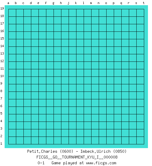 Last move : 0-1 2008 July 11 16:42:21 [Event "FICGS__GO__TOURNAMENT_KYU_I__000008"] [Site "FICGS"] [Date "2008.07.11"] [Round "1"] [Black "Petit,Charles"] [White "Imbeck,Ulrich"] [Result "0-1"] [Rating 1 "0600"] [Rating 2 "0850"] 0-1 Here are the names of the openings (joseki) played in the four corners : Player White won this Go (weiqi, baduk) game. Follow this game move after move (download)Territory is a closed space where time no longer exists. The transformation around it slower alter it, and sometimes it cracks open like a rotten egg at the least shock. (Pierre Audouard) A bird doesn't sing because it has an answer, it sings because it has a song. (Maya Angelou)