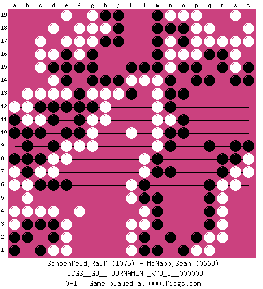 Last move : 0-1 2008 August 26 22:32:8 [Event "FICGS__GO__TOURNAMENT_KYU_I__000008"] [Site "FICGS"] [Date "2008.07.11"] [Round "1"] [Black "Schoenfeld,Ralf"] [White "McNabb,Sean"] [Result "0-1"] [Rating 1 "1075"] [Rating 2 "0668"] 1.r16 d4 2.q3 d16 3.q9 p16 4.q14 r17 5.q16 q17 6.p15 o16 7.o15 n16 8.j17 f17 9.m17 n17 10.m16 n15 11.m15 k3 12.c10 c13 13.d6 f4 14.m3 k5 15.m5 r5 16.r7 r3 17.q4 r4 18.q5 r6 19.q6 s7 20.r8 d8 21.c8 c9 22.d9 c7 23.b9 d7 24.s8 s6 25.d12 d13 26.e12 e9 27.e10 f9 28.f10 g9 29.n14 s16 30.r15 s15 31.s14 o14 32.o13 m14 33.p14 l14 34.k15 m10 35.o10 k10 36.c3 c4 37.d3 e3 38.b3 b1 39.b2 d1 40.d2 e2 41.c1 c2 42.n18 p18 43.c1 e1 44.a1 b4 45.o18 p17 46.g16 g17 47.h17 l7 48.n7 f16 49.g15 q2 50.p2 r2 51.e14 e13 52.f15 d14 53.e16 e17 54.d15 c15 55.e15 c16 56.f13 h13 57.h14 g13 58.g12 h12 59.k13 m12 60.n12 n11 61.o11 m13 62.n13 k14 63.j14 j13 64.l15 m2 65.l2 k2 66.n2 b11 67.c12 b12 68.b7 b6 69.c6 b5 70.e6 e8 71.n9 m9 72.m8 l8 73.m7 g11 74.f11 g10 75.g14 h11 76.l6 k6 77.n10 m11 78.t15 t17 79.s18 s17 80.q19 p19 81.r18 s19 82.r19 t18 83.t19 q18 84.d17 d18 85.g18 f18 86.f19 c17 87.b10 b13 88.l5 l3 89.m1 h18 90.j18 g19 91.f12 l4 92.m4 a7 93.b8 t8 94.t9 t7 95.s9 k1 96.l1 o19 97.m18 a3 98.a2 a4 99.a8 a6 100.a11 a12 101.a10 c11 102.d11 n19 103.m19 p1 104.o1 q1 105.j19 e19 106.h19 g18 107.o17 s19 108.t14 pass 0-1 Here are the names of the openings (joseki) played in the four corners : Corner q16 : r16 p16 Komoku (Somok, Xiao~mu`) 3-4 Point. The komoku (3-4) point is the traditional corner enclosure move.. Ikken Takagakari (Hankan Nop'dakeolch'im, Yi Gaogua`jiao~, 1-Space High Approach). The 5-4 approach move has become more popular in modern times, as modern Go emphasizes speed and influence. Corner d16 : d16 j17 Hoshi (Hwajeom, Seongjeom, Xingwei`) 4-4 Point. The star or hoshi (4-4) point, emphasizing influence at the potential expense of territory. Corner d4 : d4 d6 Hoshi (Hwajeom, Seongjeom, Xingwei`) 4-4 Point. The star or hoshi (4-4) point, emphasizing influence at the potential expense of territory. Ikken Takagakari (Hankan Nop'dakeolch'im, Yi Gaojia, 1-Space High Approach). White typically responds at 6-4 or 3-10. White 4-10 is played when White finds play on the right side advantageous. White 4-8 or 3-8 may be played when White has support at top. Player White won this Go (weiqi, baduk) game. Follow this game move after move (download)Don't be greedy ! (Anonymous) Chess is everything: art, science and sport. (Anatoly Karpov)
