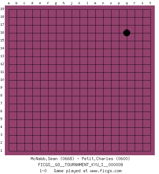 Last move : 1-0 2008 July 11 16:41:26 [Event "FICGS__GO__TOURNAMENT_KYU_I__000008"] [Site "FICGS"] [Date "2008.07.11"] [Round "1"] [Black "McNabb,Sean"] [White "Petit,Charles"] [Result "1-0"] [Rating 1 "0668"] [Rating 2 "0600"] 1.q16 1-0 Here are the names of the openings (joseki) played in the four corners : Player Black won this Go (weiqi, baduk) game. Follow this game move after move (download)You can hide nothing on the goban. (Pierre Audouard) Perception is reality. (Immanuel Kant)