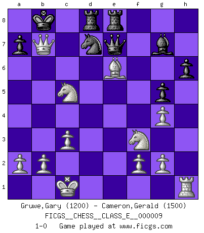 Last move : 1-0 2006 November 10 17:24:12 [Event "FICGS__CHESS__CLASS_E__000009"] [Site "FICGS"] [Date "2006.07.26"] [Round "1"] [White "Gruwe,Gary"] [Black "Cameron,Gerald"] [Result "1-0"] [WhiteElo "1200"] [BlackElo "1500"] 1.d4 Nf6 2.Nf3 e6 3.Bg5 h6 4.Bh4 d6 5.Nbd2 g5 6.Bg3 Nh5 7.e4 Bg7 8.c3 Qe7 9.Bc4 Nxg3 10.hxg3 Bd7 11.Qe2 c5 12.dxc5 dxc5 13.O-O-O Nc6 14.g4 O-O-O 15.e5 f5 16.exf6 Qxf6 17.Qe3 Qe7 18.Ne4 Rhf8 19.Nxc5 Nb8 20.Bxe6 Rfe8 21.Rxd7 Nxd7 22.Qe4 Kb8 23.Qxb7+ 1-0 Queen's pawn : Torre attack Queenside Castling by player White (move 13) Queenside Castling by player Black (move 14) Player White won this chess game. Follow this game move after move (download)The blunders are all there on the board, waiting to be made. (Savielly Tartakover) Ein Teil des Fehlers ist immer korrekt. (Savielly Grigorievitsch Tartakower) Dejen al perfeccionista jugar por correo. (Yasser Seirawan) Seul un grand joueur sait à quel point il joue faiblement. (Xavier Tartacover) Men never do evil so completely and cheerfully as when they do it from religious conviction. (Blaise Pascal)