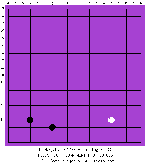Last move : 1-0 2008 July 31 16:58:44 [Event "FICGS__GO__TOURNAMENT_KYU__000065"] [Site "FICGS"] [Date "2008.07.11"] [Round "1"] [Black "Czekaj,Christophe"] [White "Ponting,Andrew"] [Result "1-0"] [Rating 1 "0177"] 1.d4 p4 2.g3 1-0 Here are the names of the openings (joseki) played in the four corners : Player Black won this Go (weiqi, baduk) game. Follow this game move after move (download)Corner, side, centre. (Anonymous) If you work for a living, why do you kill yourself working ? (Tuco to a chicken in The Good, The Bad and The Ugly)