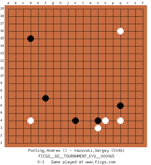 Last move : 0-1 2008 July 24 10:7:18 [Event "FICGS__GO__TOURNAMENT_KYU__000065 "] [Site "FICGS"] [Date "2008.07.11"] [Round "1"] [Black "Ponting,Andrew "] [White "Vazovski,Sergey "] [Result "0-1"] [Rating 2 "0146"] 1.f7 q16 2.d15 q4 3.k4 d4 4.q6 o4 5.n4 n3 0-1 Here are the names of the openings (joseki) played in the four corners : Corner d4 : f7 d4This joseki is unknown. A weak or weird move has probably been played in this corner. Corner q4 : q4 q6Hoshi (Hwajeom, Seongjeom, Xingwei`) 4-4 Point. The star or hoshi (4-4) point, emphasizing influence at the potential expense of territory.Ikken Takagakari (Hankan Nop'dakeolch'im, Yi Gaojia, 1-Space High Approach). White typically responds at 6-4 or 3-10. White 4-10 is played when White finds play on the right side advantageous. White 4-8 or 3-8 may be played when White has support at top. Player White won this Go (weiqi, baduk) game.Follow this game move after move (download ) The possibility or impossibility of an event results logically from the rules. (Pierre Audouard) Life is the sum of all your choices. (Albert Camus)
