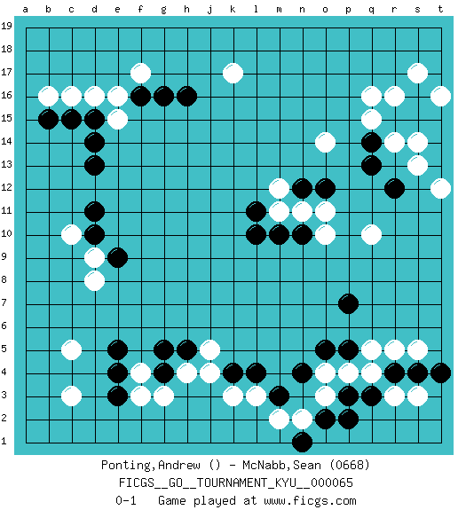 Last move : 0-1 2008 July 22 20:29:14 [Event "FICGS__GO__TOURNAMENT_KYU__000065 "] [Site "FICGS"] [Date "2008.07.11"] [Round "1"] [Black "Ponting,Andrew "] [White "McNabb,Sean "] [Result "0-1"] [Rating 2 "0668"] 1.e5 q16 2.p5 d16 3.d13 c3 4.e3 c5 5.d15 e16 6.h16 k17 7.f16 f17 8.g16 e15 9.d14 b16 10.c15 c16 11.b15 c10 12.d10 d9 13.e9 d8 14.d11 k3 15.l4 l3 16.m3 g3 17.g4 h4 18.h5 f4 19.g5 f3 20.e4 j4 21.k4 j5 22.p7 q10 23.q13 o10 24.n10 o11 25.o12 n11 26.m10 q4 27.r4 r3 28.q3 p4 29.p3 o4 30.n4 o3 31.p2 s3 32.o2 r5 33.s4 s5 34.t4 n2 35.n1 m2 36.o5 q5 37.r15 r16 38.s16 s17 39.s15 q15 40.q14 s13 41.r12 r14 42.t13 s14 43.t14 t16 44.t15 t12 45.n12 m11 46.l11 m12 47.l10 o14 0-1 Here are the names of the openings (joseki) played in the four corners : Corner d16 : d16 d13Hoshi (Hwajeom, Seongjeom, Xingwei`) 4-4 Point. The star or hoshi (4-4) point, emphasizing influence at the potential expense of territory.Nikken Takagakari (Dukan Nop'dakeolch'im, E`r Gaojia, 2-Space High Approach). Black 2 is a light approach move. Rarely played in even games, Black 2 is typically employed in handicap games. White continues with 6-4 or 3-10. In Korean Sunjang Baduk White has a stone on 8-4. Corner d4 : e5 c3Go-no-go (Wu~wu~) 5-5 Point. The 5-5 was experimented with briefly during the "New Fuseki" movement in Japan in the 1930s. The 5-5 point has not retained popularity because the 4-4 hoshi (star) point strikes a better balance between influence and territory. As one can see from the variations, though, the 5-5 is playable.San-san. Black continues with 4-3 or 5-3. Corner q16 : q16 q13Hoshi (Hwajeom, Seongjeom, Xingwei`) 4-4 Point. The star or hoshi (4-4) point, emphasizing influence at the potential expense of territory.Nikken Takagakari (Dukan Nop'dakeolch'im, E`r Gaojia, 2-Space High Approach). Black 2 is a light approach move. Rarely played in even games, Black 2 is typically employed in handicap games. White continues with 6-4 or 3-10. In Korean Sunjang Baduk White has a stone on 8-4. Player White won this Go (weiqi, baduk) game.Follow this game move after move (download ) A basic: Don't push too hard. (Jansteen) The only difference between a tax man and a taxidermist is that the taxidermist leaves the skin. (Mark Twain)