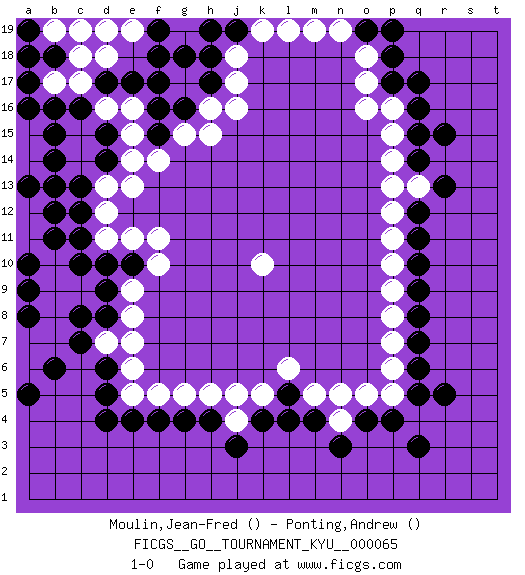 Last move : 1-0 2008 July 24 13:44:7 [Event "FICGS__GO__TOURNAMENT_KYU__000065"] [Site "FICGS"] [Date "2008.07.11"] [Round "1"] [Black "Moulin,Jean-Fred"] [White "Ponting,Andrew"] [Result "1-0"] 1.q17 p16 2.r15 p15 3.r5 p5 4.d4 d16 5.q10 p10 6.q11 p11 7.q12 p12 8.q14 p14 9.q3 q13 10.r13 p13 11.l4 b9 12.o4 n4 13.n3 m5 14.m4 n5 15.c13 d13 16.c12 c14 17.c10 c9 18.d9 d11 19.d10 d12 20.c11 e9 21.d8 d7 22.c7 b7 23.d6 e7 24.c8 b8 25.b6 e8 26.e10 f10 27.g16 h16 28.h17 g17 29.f17 g18 30.f18 g15 31.f16 j17 32.h18 g19 33.h19 j18 34.f19 e11 35.g18 k10 36.g4 h5 37.h4 j4 38.j3 k5 39.k4 j5 40.q7 p7 41.q6 p6 42.q5 o17 43.p18 o18 44.o19 n19 45.p19 e15 46.f15 f14 47.d17 c17 48.b14 c15 49.b15 d18 50.e17 h15 51.b16 b17 52.c16 e16 53.q9 p9 54.q8 p8 55.p4 g5 56.f4 f5 57.e4 e5 58.d5 b10 59.b11 a12 60.b13 a11 61.a13 a6 62.a8 a7 63.a5 m19 64.a9 l19 65.j19 k19 66.l5 l6 67.a10 o5 68.p17 o16 69.q16 e6 70.d14 e14 71.d15 e13 72.q15 j16 73.pass d19 74.b18 c18 75.a17 b19 76.a18 c19 77.a16 e19 78.b12 f11 79.a19 pass 80.pass pass 1-0 Here are the names of the openings (joseki) played in the four corners : Corner q16 : q17 p16 Komoku (Somok, Xiao~mu`) 3-4 Point. The komoku (3-4) point is the traditional corner enclosure move.. Corner q4 : r5 p5 Mokuhazushi (Waemok, Wai`mu`) 5-3 Point. The mokuhazushi (5-3) point was popular in the Edo period in Japan (1600 - 1867). It emphasizes influence; territorially, it is inferior to the 3-4 point. Corner d4 : d4 b9 Hoshi (Hwajeom, Seongjeom, Xingwei`) 4-4 Point. The star or hoshi (4-4) point, emphasizing influence at the potential expense of territory. Corner d16 : d16 c13 Hoshi (Hwajeom, Seongjeom, Xingwei`) 4-4 Point. The star or hoshi (4-4) point, emphasizing influence at the potential expense of territory. Nikken Kakari (Dukan Keolch'im, E`r Gua`jiao~, 2-Space Low Approach). White typically answers by 7-3 or 3-5 (which is not joseki). Player Black won this Go (weiqi, baduk) game. Follow this game move after move (download)Everything would seem to be possible in Go. Like pulling a rabbit, by a magical move, out of a hat. (Pierre Audouard) Home computers are being called upon to perform many new functions, including the consumption of homework formerly eaten by the dog. (Doug Larson)