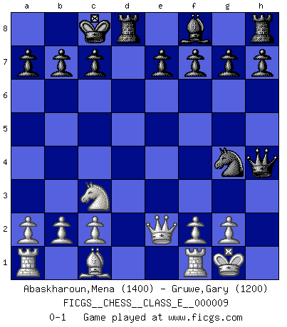 Last move : 0-1 2006 October 31 20:8:56 [Event "FICGS__CHESS__CLASS_E__000009"] [Site "FICGS"] [Date "2006.07.26"] [Round "1"] [White "Abaskharoun,Mena"] [Black "Gruwe,Gary"] [Result "0-1"] [WhiteElo "1400"] [BlackElo "1200"] 1.e4 d5 2.exd5 Nf6 3.d4 Bg4 4.Nf3 Qxd5 5.Be2 Nc6 6.Nc3 Qh5 7.O-O O-O-O 8.h3 Nxd4 9.hxg4 Nxg4 10.Nh4 Nxe2 11.Qxe2 Qxh4 0-1 Scandinavian defense Kingside Castling by player White (move 7) Queenside Castling by player Black (move 7) Player Black won this chess game. Follow this game move after move (download)I know people who have all the will in the world, but still can't play good Chess. (Bobby Fischer) Man kann eine Schachpartie nur gewinnen, wenn das Gleichgewicht gestört ist. In einer Stellung mit ungestörtem Gleichgewicht ist auch das größte Genie hilflos - in der Stellung steckt dann eben kein genialer Einfall. (Wilhelm Steinitz) Realmente no sabemos como el juego fue inventado, aunque hay sospechas. Tan pronto como descubramos a los culpables, se los haremos saber. (Bruce Pandolfini) Lorsque vous vous retrouvez devant une position atroce, ne tendez pas un ultime piège dérisoire avec l'intention d'abandonner si l'adversaire le déjoue ! Faites-vous plutôt un devoir de résister comme si votre vie en dépendait. Jouez le coup qui vous déplairait au centuple si vous étiez dans la peau de votre tortionnaire ! Perfection is achieved, not when there is nothing more to add, but when there is nothing left to take away. (Antoine de Saint-Exupéry)