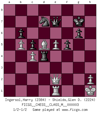 Last move : 1/2-1/2 2006 September 21 3:29:28 [Event "FICGS__CHESS__CLASS_M__000003"] [Site "FICGS"] [Date "2006.04.15"] [Round "1"] [White "Ingersol,Harry"] [Black "Shields,Glen D."] [Result "1/2-1/2"] [WhiteElo "2384"] [BlackElo "2224"] 1.e4 g6 2.d4 Bg7 3.Nf3 d6 4.c4 Nf6 5.Nc3 O-O 6.Be2 Nbd7 7.O-O e5 8.Be3 Re8 9.dxe5 Nxe5 10.Nxe5 Rxe5 11.f3 Bd7 12.Qd2 Bc6 13.Rac1 a5 14.Rfd1 Nd7 15.Nd5 Nc5 16.b3 b6 17.Bd4 Re8 18.Bxg7 Kxg7 19.Qc3+ f6 20.Rc2 h5 21.Bf1 h4 22.a3 Bb7 23.Rcd2 Re5 24.Qe3 Ra7 25.b4 axb4 26.axb4 Nd7 27.f4 Re8 28.Re1 c5 29.b5 f5 30.e5 Bxd5 31.Rxd5 dxe5 32.fxe5 Re6 33.Be2 Qe7 34.Bf3 h3 35.Qc3 hxg2 36.Rd6 Ra2 37.Rxe6 Qxe6 38.Bxg2 Qe7 39.Qg3 Rd2 40.Bd5 Rd4 41.Qe3 Kh7 42.Kh1 Kg7 43.Kg1 Rg4+ 44.Kh1 Rd4 45.Qe2 1/2-1/2 Robatsch (Modern) defense Kingside Castling by player Black (move 5) Kingside Castling by player White (move 7) This chess game ended in a draw. Follow this game move after move (download)Live, lose, and learn, by observing your opponent how to win. (Amber Steenbock) Schach ist mein Leben, meine Leidenschaft, was ich gelernt habe und seit meinem 14. Lebensjahr profimässig praktiziere. Darauf zu verzichten, würde mir sehr schwer fallen. (Viktor Kortschnoi) Vive, pierde y aprende al observar a tu oponente como ganar. (Amber Steenbock) Il vaut mieux sacrifier les pièces de l'adversaire. (Xavier Tartacover) If passion drives you, let reason holds the reins. (Benjamin Franklin)