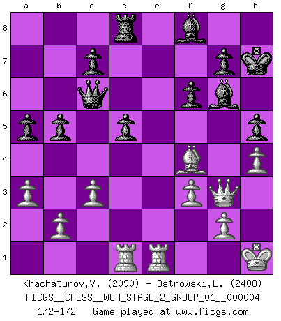 Last move : 1/2-1/2 2008 September 9 23:52:6 [Event "FICGS__CHESS__WCH_STAGE_2_GROUP_01__000004"] [Site "FICGS"] [Date "2008.07.12"] [Round "1"] [White "Khachaturov,Vadim"] [Black "Ostrowski,Leszek"] [Result "1/2-1/2"] [WhiteElo "2090"] [BlackElo "2408"] 1.e4 e5 2.Nf3 Nc6 3.Bb5 a6 4.Ba4 Nf6 5.O-O b5 6.Bb3 Bd6 7.Re1 Bb7 8.c3 O-O 9.d4 h6 10.Nbd2 Re8 11.Bc2 Qb8 12.a3 Bf8 13.Nxe5 Nxe5 14.dxe5 Rxe5 15.Nf3 Rxe4 16.Bxe4 Bxe4 17.Ne5 d5 18.Ng4 Nxg4 19.Qxg4 Qb6 20.Be3 Qc6 21.f3 Bg6 22.Rad1 Rd8 23.Qh4 f6 24.Qg3 Kh7 25.Kh1 a5 26.Bf4 Rd7 27.Qg4 Rd8 28.h4 h5 29.Qg3 1/2-1/2 Ruy Lopez : 5.O-O Kingside Castling by player White (move 5) Kingside Castling by player Black (move 8) This chess game ended in a draw. Follow this game move after move (download)All that matters on the Chessboard is good moves. (Bobby Fischer) Schach ist das schnellste Spiel der Welt, weil man in jeder Sekunde Tausende von Gedanken ordnen muß. (Albert Einstein) El Ajedrez se juega con la mente... ¡no con las manos!. (Renaud y Kahn) Si le désir cupide (et stupide) de gagner est une inépuisable source de souffrance, une combinaison brillante sur l'échiquier est une découverte : le coquelicot qui s'épanouit lorsque apparaît la Voie Lactée. (Arrabal) Industry executives and analysts often mistakenly talk about strategy as if it were some kind of chess match. But in chess, you have just two opponents, each with identical resources, and with luck playing a minimal role. The real world is much more like a poker game, with multiple players trying to make the best of whatever hand fortune has dealt them. In our industry, Bill Gates owns the table until someone proves otherwise. (David Moschella, 'Computerworld')