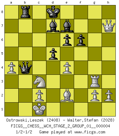 Last move : 1/2-1/2 2008 September 17 1:10:9 [Event "FICGS__CHESS__WCH_STAGE_2_GROUP_01__000004"] [Site "FICGS"] [Date "2008.07.12"] [Round "1"] [White "Ostrowski,Leszek"] [Black "Walter,Stefan"] [Result "1/2-1/2"] [WhiteElo "2408"] [BlackElo "2028"] 1.e4 c5 2.Nf3 d6 3.d4 cxd4 4.Nxd4 Nf6 5.Nc3 a6 6.Bg5 e6 7.f4 Qc7 8.Bxf6 gxf6 9.Qf3 b5 10.a3 Nc6 11.Nxc6 Qxc6 12.f5 Be7 13.O-O-O Rb8 14.Be2 Qc5 15.Rhe1 b4 16.axb4 Qxb4 17.b3 a5 18.Rd3 Rg8 19.Rf1 Rg7 20.fxe6 fxe6 21.Qh5+ Kd7 22.Rh3 Kd8 23.R1f3 a4 24.bxa4 Bd7 25.Rhg3 Rxg3 26.Rxg3 d5 27.Qxh7 1/2-1/2 Sicilian : Najdorf, 7.f4 Queenside Castling by player White (move 13) This chess game ended in a draw. Follow this game move after move (download)Openings teach you openings. Endgames teach you chess ! (Stephan Gerzadowicz) Ein Teil des Fehlers ist immer korrekt. (Savielly Grigorievitsch Tartakower) El Ajedrez es un expediente tonto que hace creer a la gente inactiva que hacen una cosa muy astuta cuando solamente estan perdiendo su tiempo. (George Bernard Shaw) Shah mat. Le roi est mort. Cri de fierté d'un joueur venant de terrasser son adversaire, courtoisement, sans effusion de sang. There will be no order, only chaos. (Sol Robeson in Pi by Darren Aronofsky)