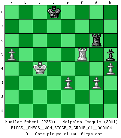Last move : 1-0 2008 November 9 10:20:36 [Event "FICGS__CHESS__WCH_STAGE_2_GROUP_01__000004"] [Site "FICGS"] [Date "2008.07.12"] [Round "1"] [White "Mueller,Robert"] [Black "Malpalma,Joaquim"] [Result "1-0"] [WhiteElo "2250"] [BlackElo "2001"] 1.e4 e5 2.Nf3 Nc6 3.Bb5 a6 4.Ba4 Nf6 5.O-O Be7 6.Re1 b5 7.Bb3 O-O 8.c3 d5 9.exd5 Nxd5 10.Nxe5 Nxe5 11.Rxe5 c6 12.d4 Bd6 13.Re1 Qh4 14.g3 Qh3 15.Re4 g5 16.Qf3 Bf5 17.Bxd5 cxd5 18.Re3 Be4 19.Rxe4 dxe4 20.Qf6 Qg4 21.Qxg5+ Qxg5 22.Bxg5 f5 23.Nd2 Kf7 24.Kf1 h5 25.Ke2 Rg8 26.h4 Ke6 27.Ke3 Kd7 28.Rc1 Rab8 29.c4 bxc4 30.Nxc4 Bc7 31.b3 Rgc8 32.d5 Rb4 33.Bf4 R4b8 34.Kd4 a5 35.Bxc7 Rxc7 36.Rc3 a4 37.bxa4 Rb4 38.d6 Rc8 39.Kd5 Kd8 40.a5 Rb5+ 41.Kd4 Rbc5 42.a3 R5c6 43.a4 Rb8 44.Kd5 Rbc8 45.a6 Rc5+ 46.Kd4 R5c6 47.a7 Ra6 48.a5 Rxa7 49.Rb3 Ra6 50.Kd5 Rxc4 51.Kxc4 Rxd6 52.Rb5 e3 53.fxe3 Rg6 54.Rxf5 1-0 Ruy Lopez : Closed, 7...O-O Kingside Castling by player White (move 5) Kingside Castling by player Black (move 7) 10 pieces endgame at move 53 : White KRPPPP , Black KRPP WHITE : King + 1 Rook 4 Pawns BLACK : King + 1 Rook 2 Pawns 9 pieces endgame at move 54 : White KRPPPP , Black KRP WHITE : King + 1 Rook 4 Pawns BLACK : King + 1 Rook 1 Pawn Player White won this chess game. Follow this game move after move (download)In complicated positions, Bobby Fischer hardly had to be afraid of anybody. (Paul Keres) Kritik überlasse ich den Spießern. Ich zeige nichts, wofür ich mich schämen muss. (Alexandra Kosteniuk) El Ajedrez es una manera fabulosa para que los niños aprendan a autovalorarse y a autoestimarse. (Saudin Robovic) Aux échecs, les retours au sommet sont rares : les dommages psychologiques consécutifs à une défaite sont trop sévères. (Daily Telegraph) Work expands to fill the time available. (C. Northcote Parkinson, in Parkinson's Laws)