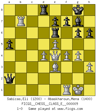 Last move : 1-0 2006 November 3 8:53:36 [Event "FICGS__CHESS__CLASS_E__000009"] [Site "FICGS"] [Date "2006.07.26"] [Round "1"] [White "Sabicas,Eli"] [Black "Abaskharoun,Mena"] [Result "1-0"] [WhiteElo "1200"] [BlackElo "1400"] 1.c4 g6 2.d4 Nf6 3.Nf3 Bg7 4.Nc3 d5 5.cxd5 Nxd5 6.e4 Nxc3 7.bxc3 c5 8.Be3 Qa5 9.Qd2 Bg4 10.e5 Nc6 11.Be2 O-O 12.h3 Bxf3 13.Bxf3 Rac8 14.Bxc6 Rxc6 15.O-O Rd8 16.Qb2 Rb6 17.Qc2 cxd4 18.cxd4 Rc6 19.Qe4 h6 20.Rab1 Qxa2 21.Rxb7 Re6 22.g4 a5 23.f4 1-0 English Opening Kingside Castling by player Black (move 11) Kingside Castling by player White (move 15) Player White won this chess game. Follow this game move after move (download)Chess books should be used as we use glasses: to assist the sight, although some players make use of them as if they thought they conferred sight. (Jose Raul Capablanca) Gegen einen Schachcomputer zu verlieren ist wie Löcher in den Strümpfen zuhaben. Es ist nicht peinlich, solange man der einzige ist der es weiß. (Anonymous) Diferente gente reacciona diferentemente en aceptar la derrota. (Bobby Fischer) C'est la seule position que je connaisse où les deux camps sont mals. Propos prêtés à V. Anand. Empty your mind, be formless, shapeless — like water. (Bruce Lee)