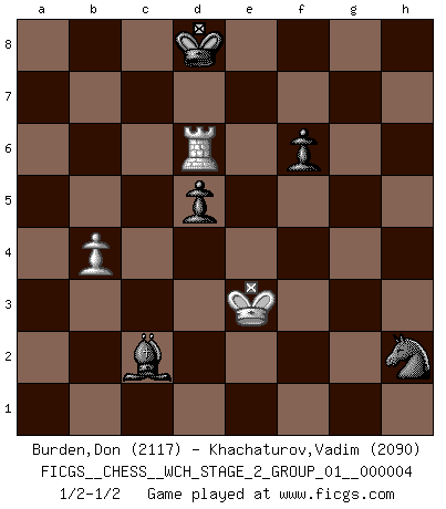Last move : 1/2-1/2 2008 October 22 23:5:47 [Event "FICGS__CHESS__WCH_STAGE_2_GROUP_01__000004"] [Site "FICGS"] [Date "2008.07.12"] [Round "1"] [White "Burden,Don"] [Black "Khachaturov,Vadim"] [Result "1/2-1/2"] [WhiteElo "2117"] [BlackElo "2090"] 1.e4 c5 2.Nf3 d6 3.d4 cxd4 4.Nxd4 Nf6 5.Nc3 a6 6.Be3 e6 7.f3 b5 8.g4 h6 9.Qd2 Nbd7 10.O-O-O Bb7 11.h4 b4 12.Na4 Qa5 13.b3 Nc5 14.a3 Nxa4 15.axb4 Qc7 16.bxa4 d5 17.e5 Nd7 18.f4 Nb6 19.Rh3 Nxa4 20.Bf2 Be7 21.Be1 Bc8 22.f5 Rb8 23.Rb3 Bd7 24.Bxa6 Ra8 25.Bd3 Nb6 26.fxe6 fxe6 27.Bg6+ Kd8 28.Bf7 Qxe5 29.Bxe6 Bf6 30.Qf2 Nc4 31.Bc3 Re8 32.Bf7 Rf8 33.Nc6+ Bxc6 34.Bxe5 Bxe5 35.Rb1 Ra7 36.Rf1 Raxf7 37.Qxf7 Rxf7 38.Rxf7 Be8 39.Ra7 Bf4+ 40.Kd1 Bd7 41.g5 hxg5 42.hxg5 Bxg5 43.Ke2 Bg4+ 44.Kd3 Ne5+ 45.Kc3 Bf6 46.Ra6 Nf3 47.Kd3 Bf5+ 48.Ke3 Bxc2 49.Rf1 Nh2 50.R1xf6 gxf6 51.Rd6+ 1/2-1/2 Sicilian : Najdorf, Byrne (English) attack Queenside Castling by player White (move 10) 10 pieces endgame at move 48 : White KRRP , Black KBBNPP WHITE : King + 2 Rooks 1 Pawn BLACK : King + 2 Bishops 1 Knight 2 Pawns 9 pieces endgame at move 50 : White KRRP , Black KBNPP WHITE : King + 2 Rooks 1 Pawn BLACK : King + 1 Bishop 1 Knight 2 Pawns 8 pieces endgame at move 50 : White KRP , Black KBNPP WHITE : King + 1 Rook 1 Pawn BLACK : King + 1 Bishop 1 Knight 2 Pawns This chess game ended in a draw. Follow this game move after move (download)Only the player with the initiative has the right to attack. (Wilhelm Steinitz) Es gibt keine einzige Frau, der ich nicht einen Springer vorgeben könnte und trotzdem gewänne. (Robert James Fischer) El juego de Damas es para vagabundos. (Paul Morphy) Même un GMI sait rarement calculer sur plus de cinq coups une attaque à sacrifices. (Rudolf Spielmann) Luck has a peculiar habit of favoring those who don't depend on it. (Author unknown)