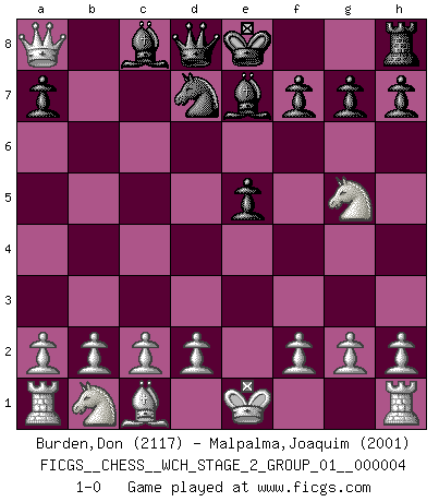Last move : 1-0 2008 July 31 3:4:36 [Event "FICGS__CHESS__WCH_STAGE_2_GROUP_01__000004"] [Site "FICGS"] [Date "2008.07.12"] [Round "1"] [White "Burden,Don"] [Black "Malpalma,Joaquim"] [Result "1-0"] [WhiteElo "2117"] [BlackElo "2001"] 1.e4 e5 2.Nf3 Nc6 3.Bc4 Nf6 4.Ng5 d5 5.exd5 Na5 6.Bb5+ c6 7.dxc6 bxc6 8.Qf3 Be7 9.Bxc6+ Nxc6 10.Qxc6+ Nd7 11.Qxa8 1-0 Two knights defense Player White won this chess game. Follow this game move after move (download)Is Bobby Fischer quite sane ? (Salo Flohr) Die Arbeit ist etwas Unnatürliches. Die Faulheit allein ist göttlich. (Anatole France) Cuando tengo las piezas blancas, yo gano porque soy blanco; Cuando tengo las piezas negras, yo gano porque soy Bogolyubov. (Bogolyubov) Botvinnik disait en comparant les échecs à la musique: Il existe une science dont le but est l'étude de l'acoustique et des sons. Mais il y a aussi un art qui se sert de l'océan des sons : c'est la musique. De toute évidence, il en est de même pour la pensée. La logique est l'étude des lois de la réflexion et les échecs reflètent, en tant qu'art, le côté logique de la réflexion, sous la forme d'images artistiques... Extrait de Fischer - Spassky, Reykjavik 1972 par Alexander & F. Wyndham (Ed. Solar), p 37. Quotation,n.: The act of repeating erroneously the words of another. The words erroneously repeated. (Ambrose Bierce, The Devil's Dictionary)